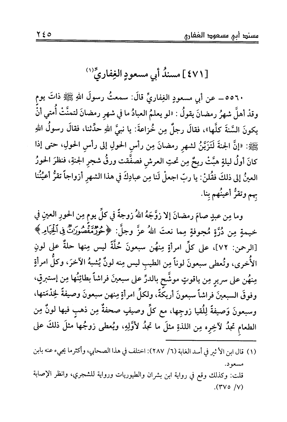 5560 - عن أبي مسعودٍ الغِفاريِّ قالَ: سمعتُ رسولَ اللهِ صلى الله عليه وسلم ذاتَ يومٍ وقدْ أهلَّ شهرُ رمضانَ يقولُ: «لو يعلمُ العبادُ ما في شهرِ رمضانَ لتمنَّتْ أُمتي أنْ يكونَ السَّنةَ كلَّها»، فقالَ رجلٌ مِن خُزاعةَ: يا نبيَّ اللهِ حدِّثنا، فقالَ رسولُ اللهِ صلى الله عليه وسلم: «إنَّ الجنةَ لَتَزَيَّنُ لشهرِ رمضانَ مِن رأسِ الحولِ إلى رأسِ الحولِ، حتى إذا كانَ أولُ ليلةٍ هبَّتْ ريحٌ مِن تحتِ العرشِ فصفَّقت ورقُ شجرِ الجنةِ، فنظرَ الحورُ العينُ إلى ذلكَ فقُلنْ: يا ربّ اجعلْ لَنا مِن عبادِكَ في هذا الشهرِ أزواجاً تقرُّ أعيُنُنا بِهم وتقرُّ أعينُهم بِنا.