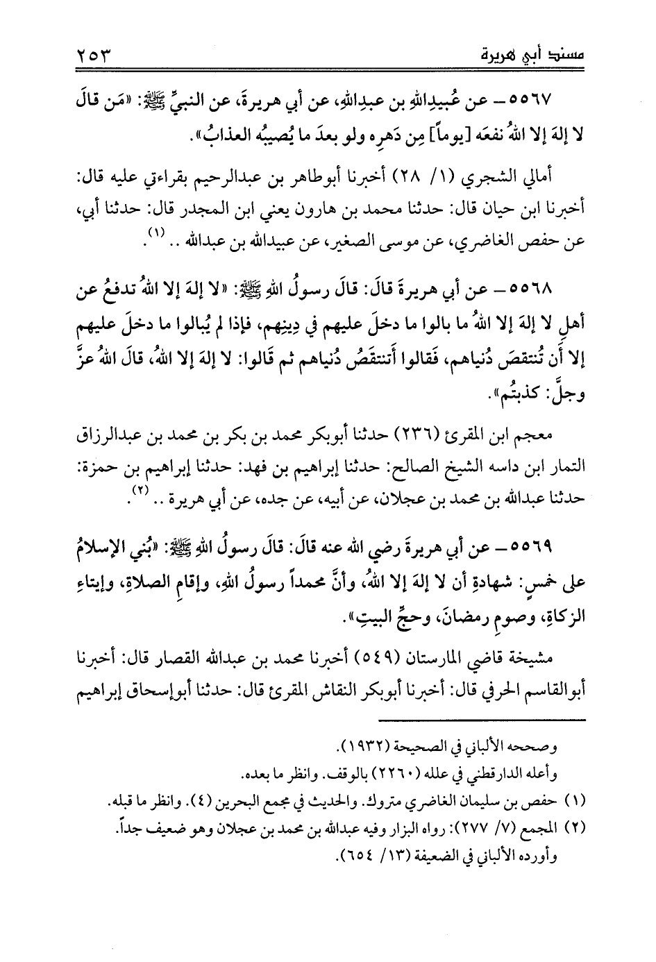 5569 - عن أبي هريرةَ رضي الله عنه قالَ: قالَ رسولُ اللهِ صلى الله عليه وسلم: «بُني الإسلامُ على خمسٍ: شهادةِ أن لا إلهَ إلا اللهُ، وأنَّ محمداً رسولُ اللهِ، وإقامِ الصلاةِ، وإيتاءِ الزكاةِ، وصومِ رمضانَ، وحجِّ البيتِ».