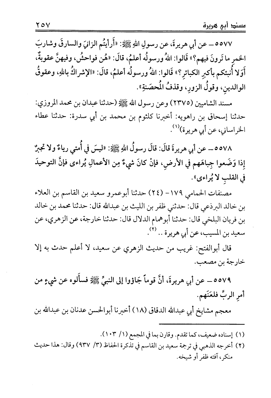 مصنفات الحمامي 179 - (24) حدثنا أبوعمرو سعيد بن القاسم بن العلاء بن خالد البرذعي قال: حدثني ظفر بن الليث بن عبدالله قال: حدثنا محمد بن خالد بن فريان البلخي قال: حدثنا أبوهمام الدلال قال: حدثنا خارجة، عن الزهري، عن سعيد بن المسيب، عن أبي هريرة .. (¬2).
