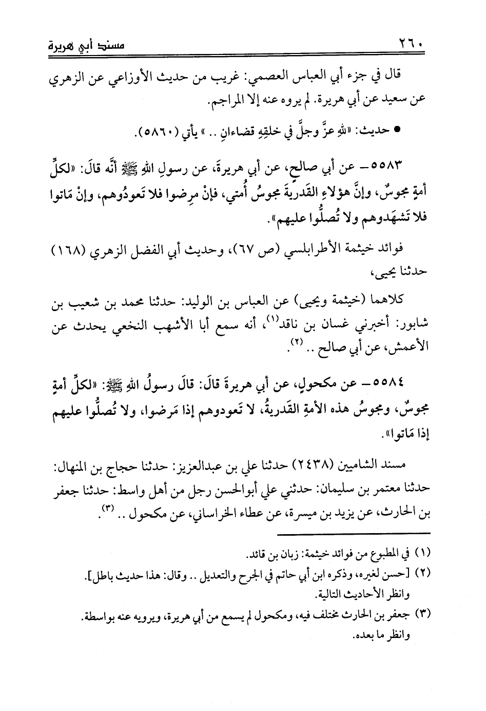 5584 - عن مكحولٍ، عن أبي هريرةَ قالَ: قالَ رسولُ اللهِ صلى الله عليه وسلم: «لكلِّ أمةٍ مجوسٌ، ومجوسُ هذه الأمةِ القَدريةُ، لا تَعودوهم إذا مَرضوا، ولا تُصلُّوا عليهم إذا مَاتوا».
