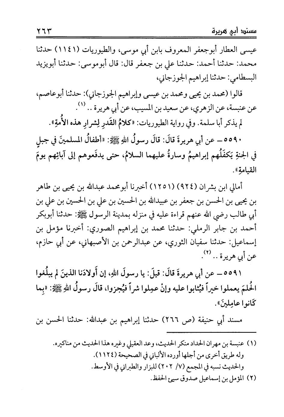 5590 - عن أبي هريرةَ قالَ: قالَ رسولُ اللهِ صلى الله عليه وسلم: «أطفالُ المسلمينَ في جبلٍ في الجنةِ يَكفَلُهم إبراهيمُ وسارةُ عليهما السلامُ، حتى يدفَعوهم إلى آبائِهم يومَ القيامةِ».