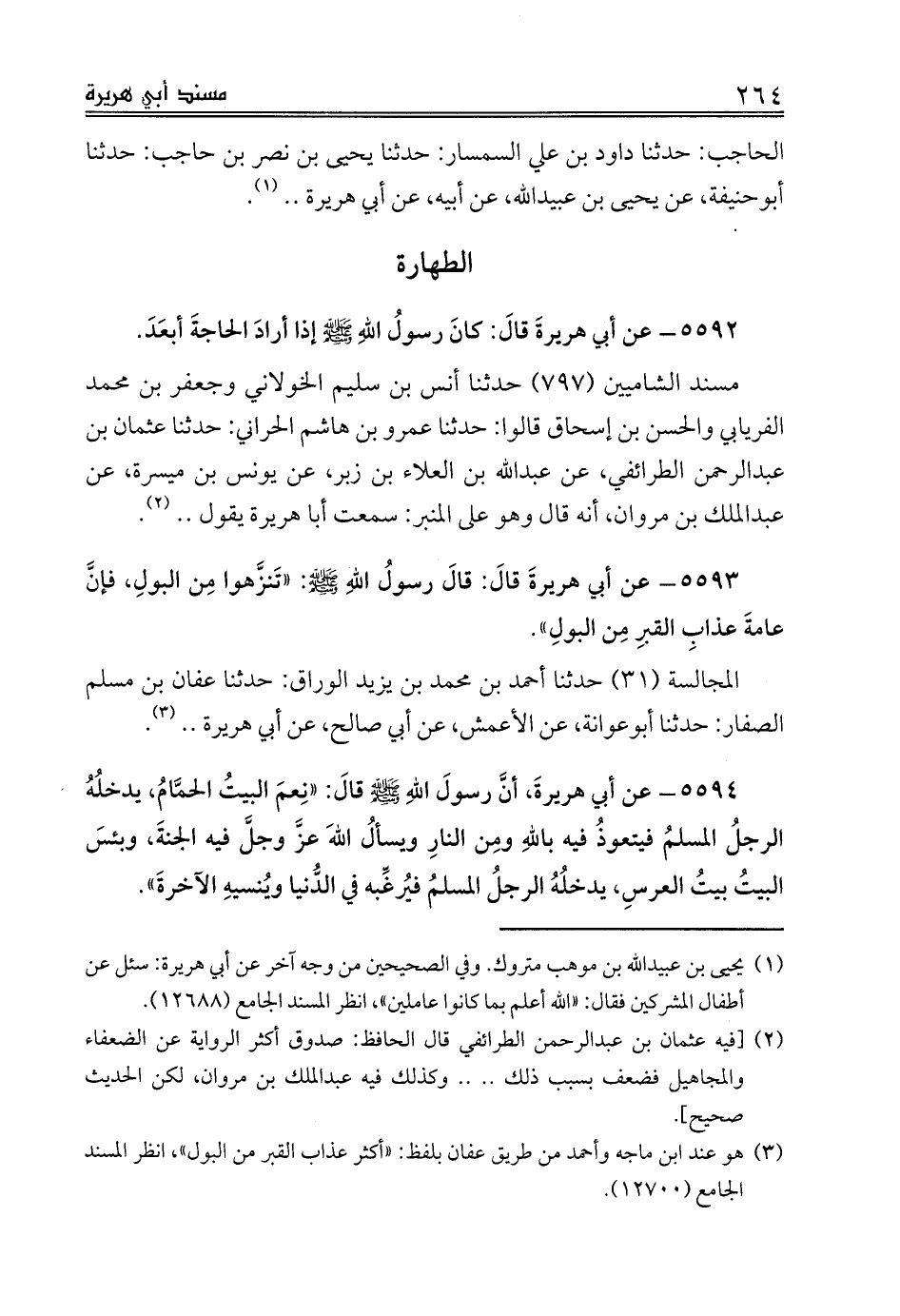 (¬3) هو عند ابن ماجه وأحمد من طريق عفان بلفظ: «أكثر عذاب القبر من البول»، انظر المسند الجامع (12700).