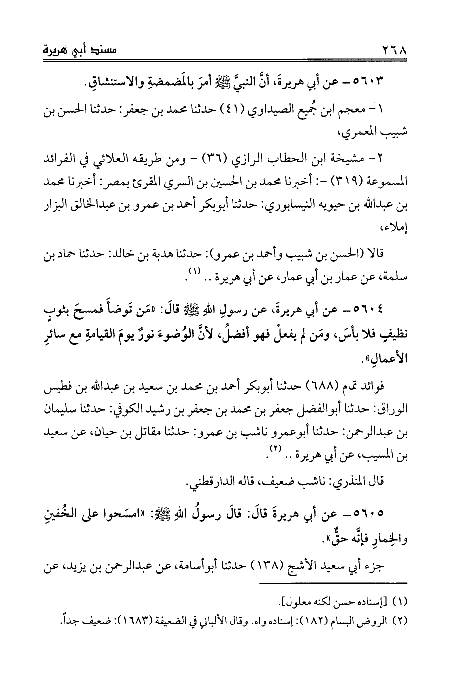 فوائد تمام (688) حدثنا أبوبكر أحمد بن محمد بن سعيد بن عبدالله بن فطيس الوراق: حدثنا أبوالفضل جعفر بن محمد بن جعفر بن رشيد الكوفي: حدثنا سليمان بن عبدالرحمن: حدثنا أبوعمرو ناشب بن عمرو: حدثنا مقاتل بن حيان، عن سعيد بن المسيب، عن أبي هريرة .. (¬2).
