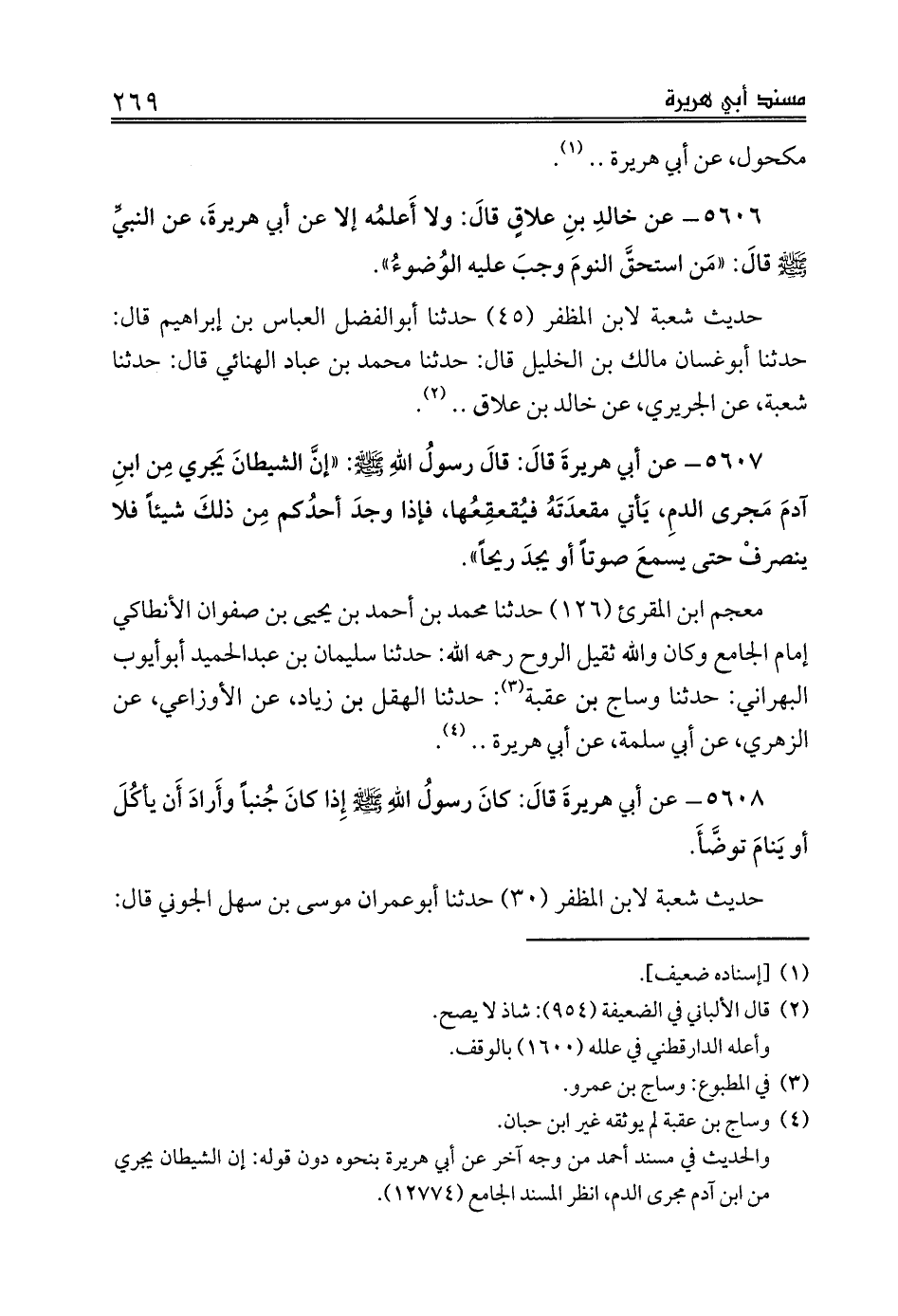 5606 - عن خالدِ بنِ علاقٍ قالَ: ولا أَعلمُه إلا عن أبي هريرةَ، عن النبيِّ صلى الله عليه وسلم قالَ: «مَن استحقَّ النومَ وجبَ عليه الوُضوءُ».