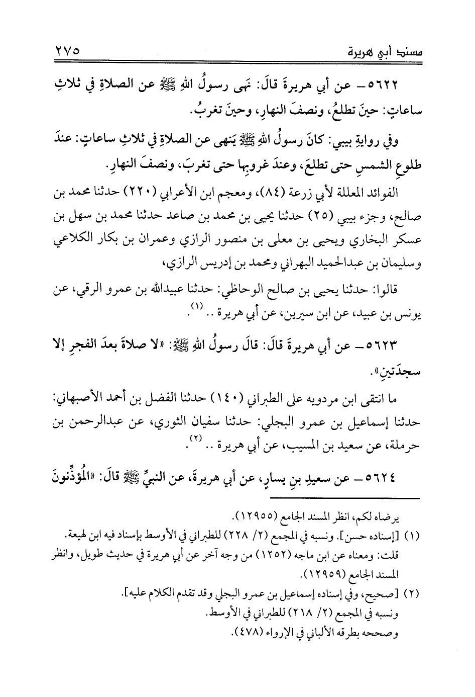 5623 - عن أبي هريرةَ قالَ: قالَ رسولُ اللهِ صلى الله عليه وسلم: «لا صلاةَ بعدَ الفجرِ إلا سجدَتينِ».