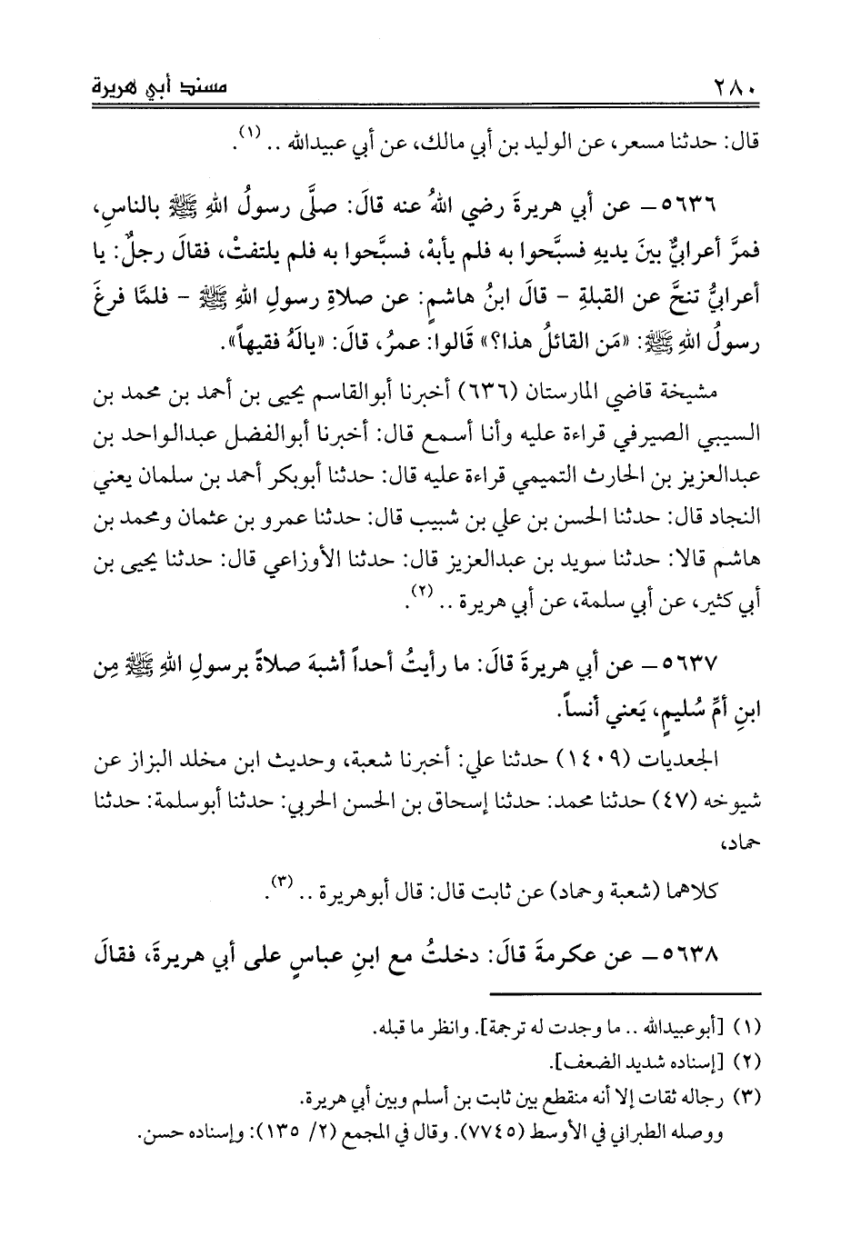 مشيخة قاضي المارستان (636) أخبرنا أبوالقاسم يحيى بن أحمد بن محمد بن السيبي الصيرفي قراءة عليه وأنا أسمع قال: أخبرنا أبوالفضل عبدالواحد بن عبدالعزيز بن الحارث التميمي قراءة عليه قال: حدثنا أبوبكر أحمد بن سلمان يعني النجاد قال: حدثنا الحسن بن علي بن شبيب قال: حدثنا عمرو بن عثمان ومحمد بن هاشم قالا: حدثنا سويد بن عبدالعزيز قال: حدثنا الأوزاعي قال: حدثنا يحيى بن أبي كثير، عن أبي سلمة، عن أبي هريرة .. (¬2).