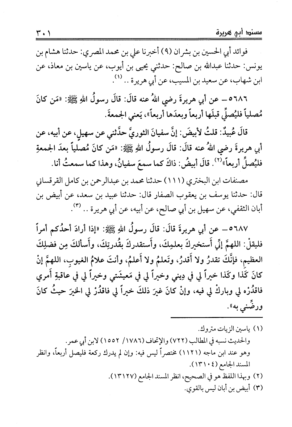 مصنفات ابن البختري (111) حدثنا محمد بن عبدالرحمن بن كامل القرقساني قال: حدثنا يوسف بن يعقوب الصفار قال: حدثنا عبيد بن سعد، عن أبيض بن أبان الثقفي، عن سهيل بن أبي صالح، عن أبيه، عن أبي هريرة .. (¬3).