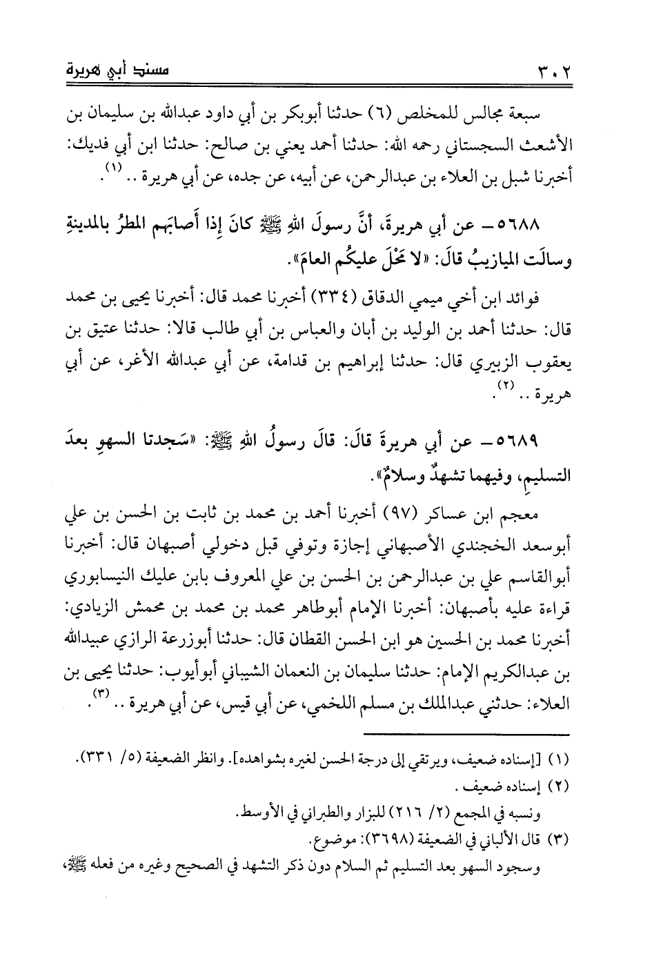 5689 - عن أبي هريرةَ قالَ: قالَ رسولُ اللهِ صلى الله عليه وسلم: «سَجدتا السهوِ بعدَ التسليمِ، وفيهما تشهدٌ وسلامٌ».