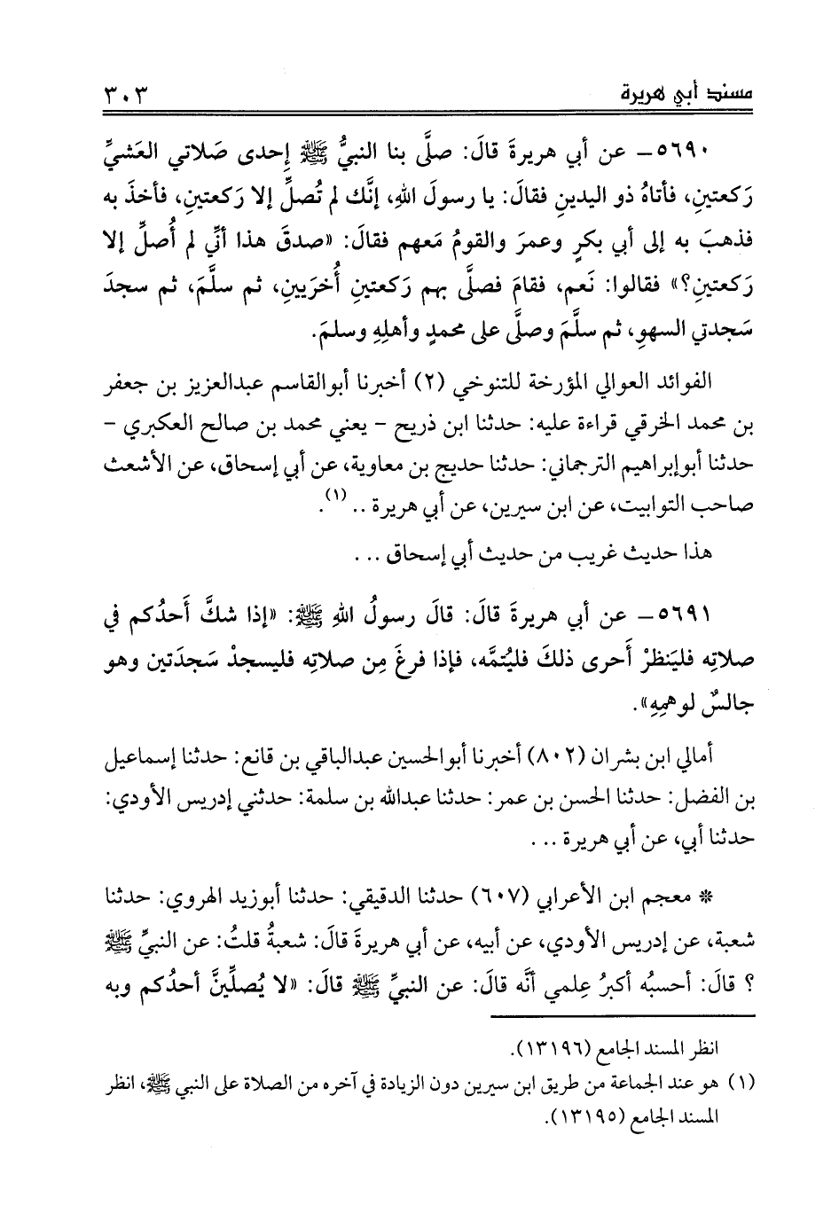 5690 - عن أبي هريرةَ قالَ: صلَّى بنا النبيُّ صلى الله عليه وسلم إِحدى صَلاتي العَشيِّ رَكعتينِ، فأتاهُ ذو اليدينِ فقالَ: يا رسولَ اللهِ، إنَّك لم تُصلِّ إلا رَكعتينِ، فأخذَ به فذهبَ به إلى أبي بكرٍ وعمرَ والقومُ مَعهم فقالَ: «صدقَ هذا أنِّي لم أُصلِّ إلا رَكعتينِ؟» فقالوا: نَعم، فقامَ فصلَّى بهم رَكعتينِ أُخرَيينِ، ثم سلَّمَ، ثم سجدَ سَجدتي السهوِ، ثم سلَّمَ وصلَّى على محمدٍ وأهلِهِ وسلمَ.