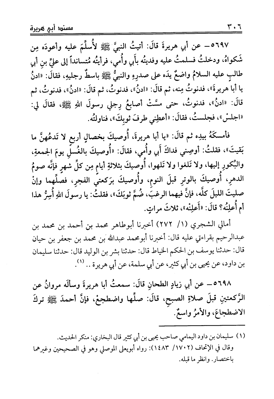 أمالي الشجري (1/ 272) أخبرنا أبوطاهر محمد بن أحمد بن محمد بن عبدالرحيم بقراءتي عليه قال: أخبرنا أبومحمد عبدالله بن محمد بن جعفر بن حيان قال: حدثنا يوسف بن الحكم الخياط قال: حدثنا بشر بن الوليد قال: حدثنا سليمان بن داود، عن يحيى بن أبي كثير، عن أبي سلمة، عن أبي هريرة .. (¬1).