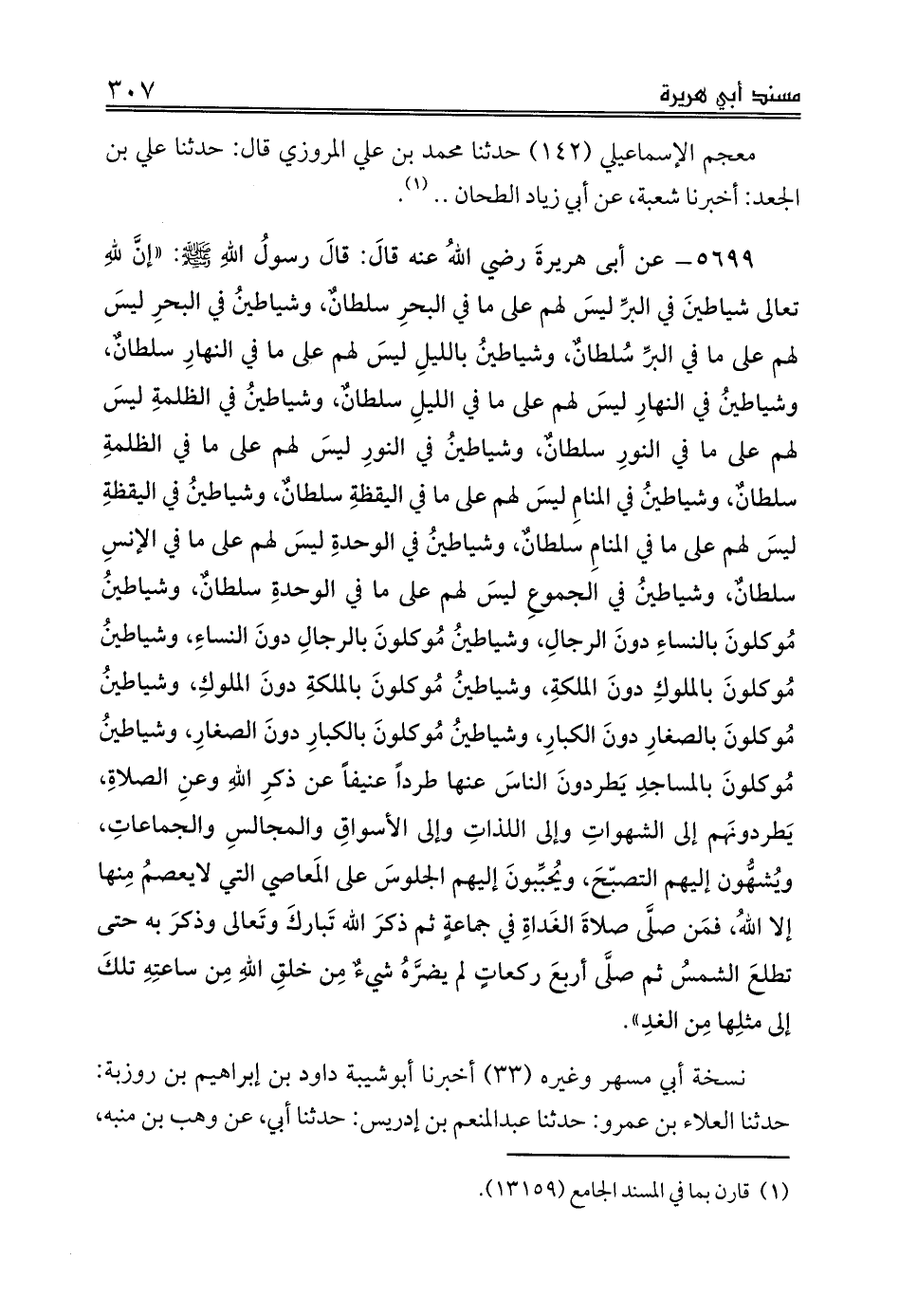 5699 - عن أبى هريرةَ رضي اللهُ عنه قالَ: قالَ رسولُ اللهِ صلى الله عليه وسلم: «إنَّ للهِ تعالى شياطينَ في البرِّ ليسَ لهم على ما في البحرِ سلطانٌ، وشياطينُ في البحرِ ليسَ لهم على ما في البرِّ سُلطانٌ، وشياطينُ بالليلِ ليسَ لهم على ما في النهارِ سلطانٌ، وشياطينُ في النهارِ ليسَ لهم على ما في الليلِ سلطانٌ، وشياطينُ في الظلمةِ ليسَ لهم على ما في النورِ سلطانٌ، وشياطينُ في النورِ ليسَ لهم على ما في الظلمةِ سلطانٌ، وشياطينُ في المنامِ ليسَ لهم على ما في اليقظةِ سلطانٌ، وشياطينُ في اليقظةِ ليسَ لهم على ما في المنامِ سلطانٌ، وشياطينُ في الوحدةِ ليسَ لهم على ما في الإنسِ سلطانٌ، وشياطينُ في الجموعِ ليسَ لهم على ما في الوحدةِ سلطانٌ، وشياطينُ مُوكلونَ بالنساءِ دونَ الرجالِ، وشياطينُ مُوكلونَ بالرجالِ دونَ النساءِ، وشياطينُ مُوكلونَ بالملوكِ دونَ الملكةِ، وشياطينُ مُوكلونَ بالملكةِ دونَ الملوكِ، وشياطينُ مُوكلونَ بالصغارِ دونَ الكبارِ، وشياطينُ مُوكلونَ بالكبارِ دونَ الصغارِ، وشياطينُ مُوكلونَ بالمساجدِ يَطردونَ الناسَ عنها طرداً عنيفاً عن ذكرِ اللهِ وعنِ الصلاةِ، يَطردونَهم إلى الشهواتِ وإلى اللذاتِ وإلى الأسواقِ والمجالسِ والجماعاتِ، ويُشهُّون إليهم التصبّحَ، ويُحبِّبونَ إليهم الجلوسَ على المَعاصي التي لايعصمُ مِنها إلا اللهُ، فمَن صلَّى صلاةَ الغَداةِ في جماعةٍ ثم ذكرَ الله تَباركَ وتَعالى وذكرَ به حتى تطلعَ الشمسُ ثم صلَّى أربعَ ركعاتٍ لم يضرَّهُ شيءٌ مِن خلقِ اللهِ مِن ساعتِهِ تلكَ إلى مثلِها مِن الغدِ».