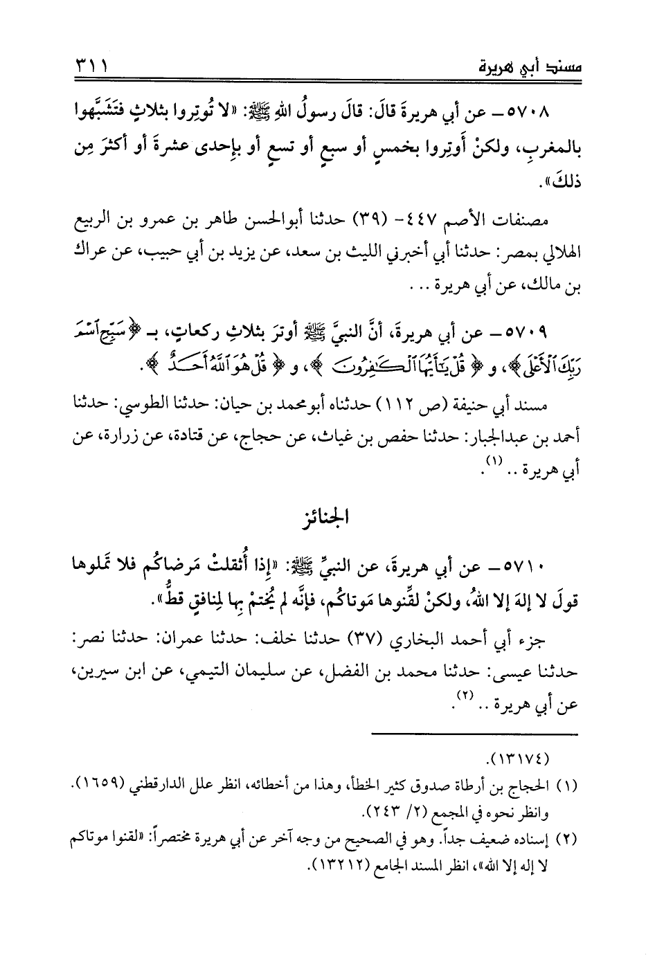 مسند أبي حنيفة (ص 112) حدثناه أبومحمد بن حيان: حدثنا الطوسي: حدثنا أحمد بن عبدالجبار: حدثنا حفص بن غياث، عن حجاج، عن قتادة، عن زرارة، عن أبي هريرة .. (¬1).