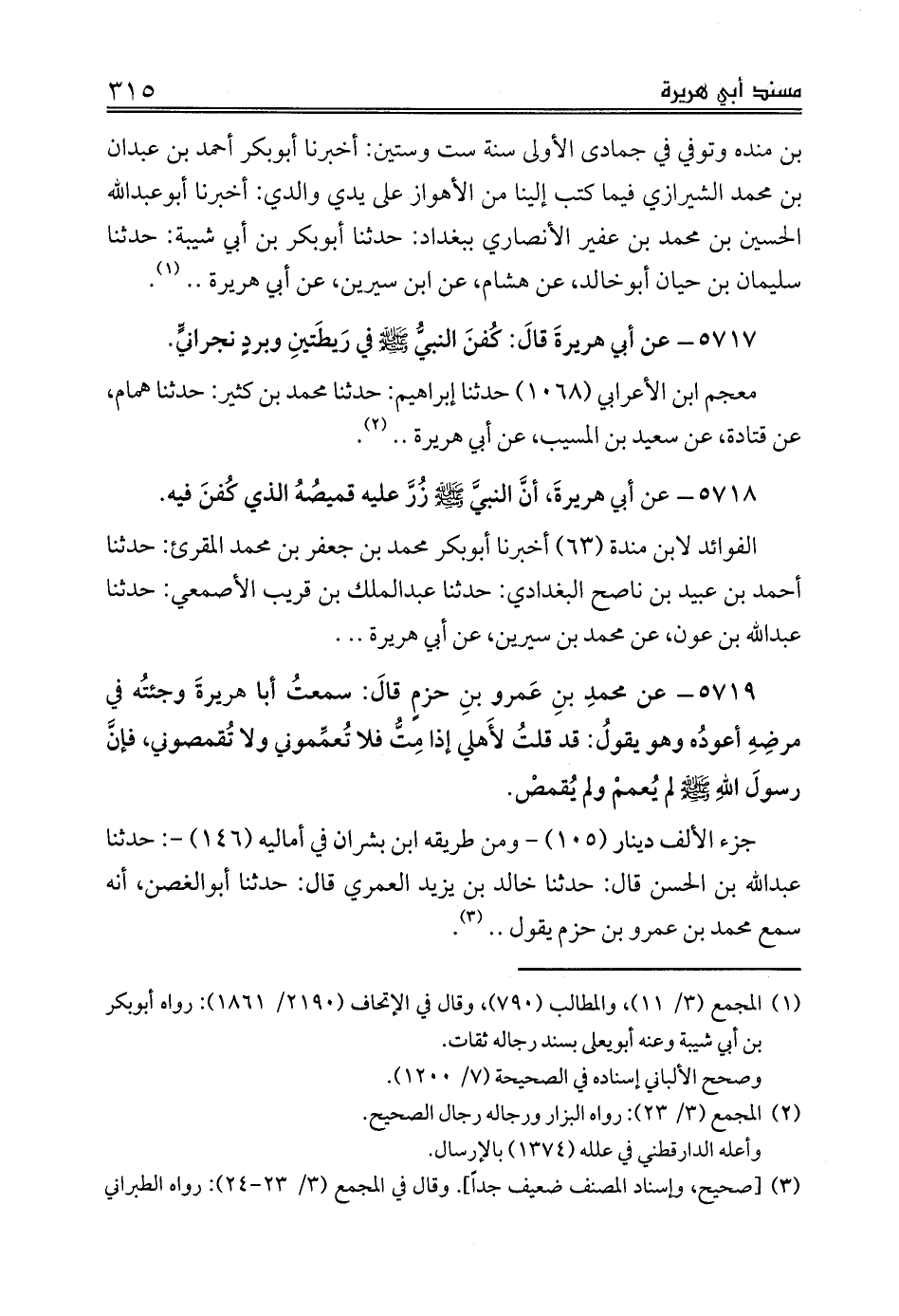 5717 - عن أبي هريرةَ قالَ: كُفنَ النبيُّ صلى الله عليه وسلم في رَيطَتينِ وبردٍ نجرانيٍّ.