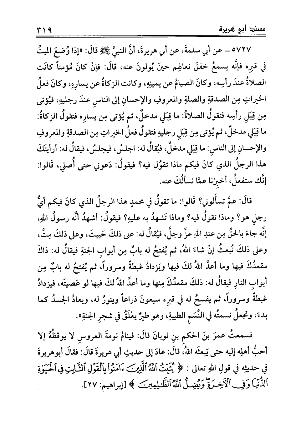 فسمعتُ عمرَ بنَ الحكمِ بنِ ثوبانَ قالَ: فينامُ نومةَ العروسِ لا يوقظُهُ إلا أحبُّ أهلِه إليه حتى يَبعثَه اللهُ، قالَ: عادَ إلى حديثِ أبي هريرةَ قالَ: فقالَ أبوهريرةَ في حديثِه في قولِ اللهِ تعالى: {يُثَبِّتُ اللَّهُ الَّذِينَ آمَنُوا بِالْقَوْلِ الثَّابِتِ فِي الْحَيَاةِ الدُّنْيَا وَفِي الْآخِرَةِ وَيُضِلُّ اللَّهُ الظَّالِمِينَ} [إبراهيم: 27].