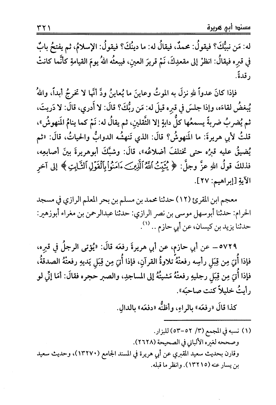 5729 - عن أبي حازمٍ، عن أبي هريرةَ رفعَه قالَ: «يُؤتى الرجلُ في قبرِه، فإذا أُتيَ مِن قِبَلِ رأسِه رفعتْهُ تلاوةُ القرآنِ، فإذا أُتيَ مِن قِبَلِ يَديهِ رفعتْهُ الصدقةُ، فإذا أُتيَ مِن قِبَلِ رجليهِ رفعتْهُ مَشيتُهُ إلى المساجدِ، والصبر حجره فقالَ: أمَا إنِّي لو رأيتُ خليلاً كنت صاحبَه».