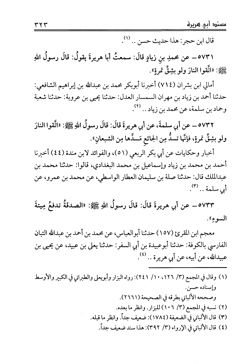 5733 - عن أبي هريرةَ قالَ: قالَ رسولُ اللهِ صلى الله عليه وسلم: «الصدقةُ تدفعُ مِيتةَ السوءِ».