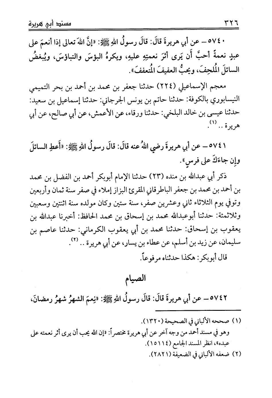 5740 - عن أبي هريرةَ قالَ: قالَ رسولُ اللهِ صلى الله عليه وسلم: «إنَّ اللهَ تعالى إذا أنعمَ على عبدٍ نعمةً أحبَّ أَن يَرى أثرَ نعمتِهِ عليهِ، ويكرهُ البؤسَ والتباؤسَ، ويُبغضُ السائلَ المُلحِفَ، ويحبُّ العفيفَ المُتعففَ».