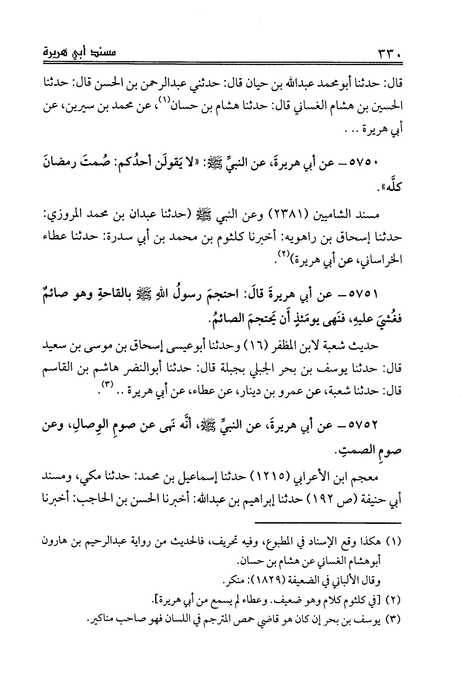 قال: حدثنا أبومحمد عبدالله بن حيان قال: حدثني عبدالرحمن بن الحسن قال: حدثنا الحسين بن هشام الغساني قال: حدثنا هشام بن حسان (¬1)، عن محمد بن سيرين، عن أبي هريرة .. .