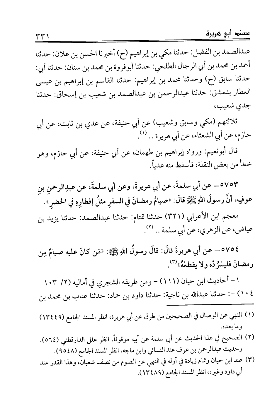 5753 - عن أبي سلمةَ، عن أبي هريرةَ، وعن أبي سلمةَ، عن عبدِالرحمنِ بنِ عوفٍ، أنَّ رسولَ اللهِ صلى الله عليه وسلم قالَ: «صيامُ رمضانَ في السفرِ مثلُ إفطارِهِ في الحضرِ».