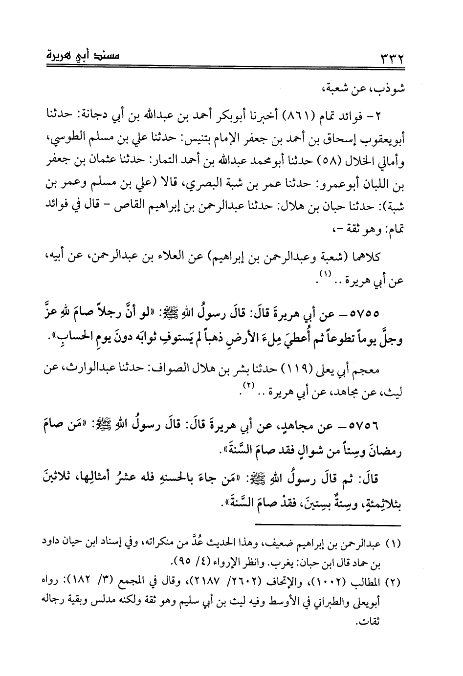 5756 - عن مجاهدٍ، عن أبي هريرةَ قالَ: قالَ رسولُ اللهِ صلى الله عليه وسلم: «مَن صامَ رمضانَ وسِتاً من شوالٍ فقد صامَ السَّنةَ».