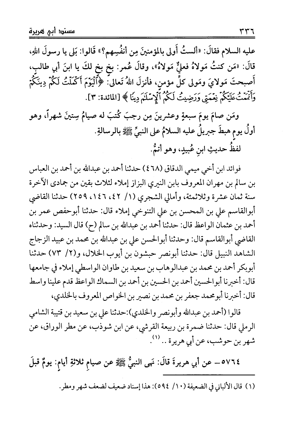 5764 - عن أبي هريرةَ قالَ: نَهى النبيُّ صلى الله عليه وسلم عن صيامِ ثلاثةِ أيامٍ: يومٌ قبلَ