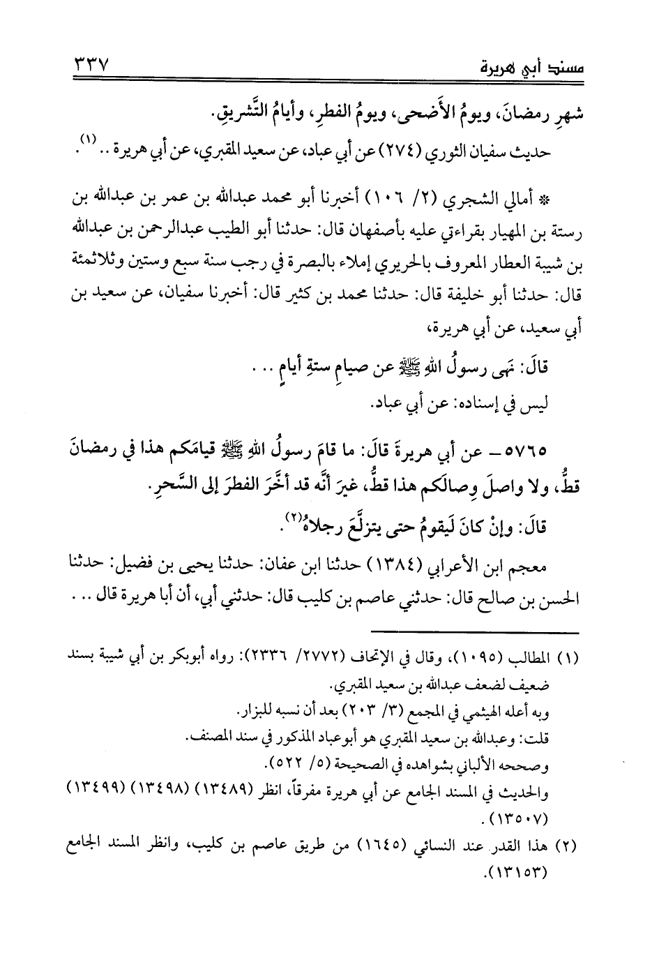(¬1) المطالب (1095)، وقال في الإتحاف (2772/ 2336): رواه أبوبكر بن أبي شيبة بسند ضعيف لضعف عبدالله بن سعيد المقبري.