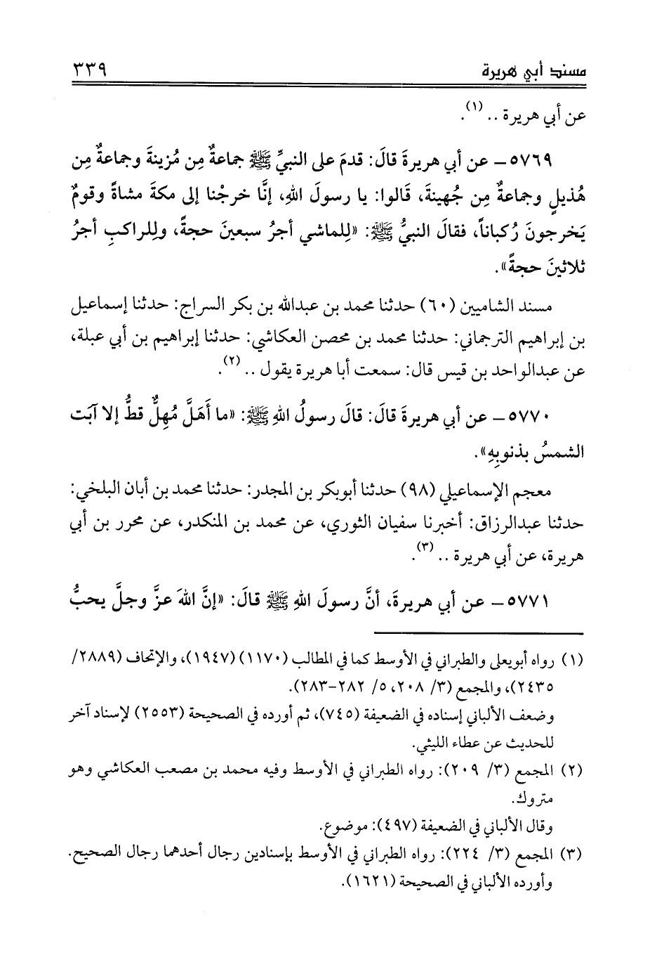 5769 - عن أبي هريرةَ قالَ: قدمَ على النبيِّ صلى الله عليه وسلم جماعةٌ مِن مُزينةَ وجماعةٌ مِن هُذيلٍ وجماعةٌ مِن جُهينةَ، قَالوا: يا رسولَ اللهِ، إنَّا خرجْنا إلى مكةَ مشاةً وقومٌ يَخرجونَ رُكباناً، فقالَ النبيُّ صلى الله عليه وسلم: «لِلماشي أجرُ سبعينَ حجةً، ولِلراكبِ أجرُ ثلاثينَ حجةً».