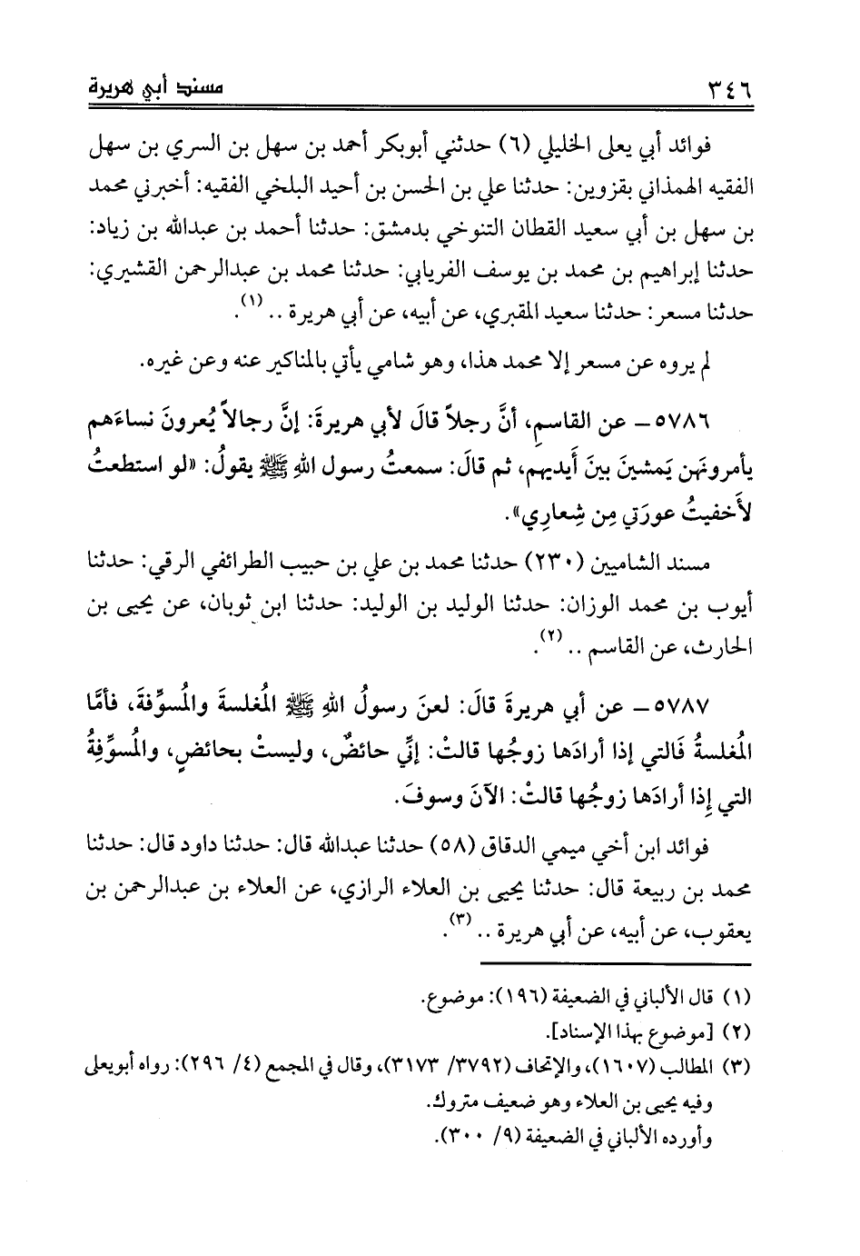 فوائد أبي يعلى الخليلي (6) حدثني أبوبكر أحمد بن سهل بن السري بن سهل الفقيه الهمذاني بقزوين: حدثنا علي بن الحسن بن أحيد البلخي الفقيه: أخبرني محمد بن سهل بن أبي سعيد القطان التنوخي بدمشق: حدثنا أحمد بن عبدالله بن زياد: حدثنا إبراهيم بن محمد بن يوسف الفريابي: حدثنا محمد بن عبدالرحمن القشيري: حدثنا مسعر: حدثنا سعيد المقبري، عن أبيه، عن أبي هريرة .. (¬1).