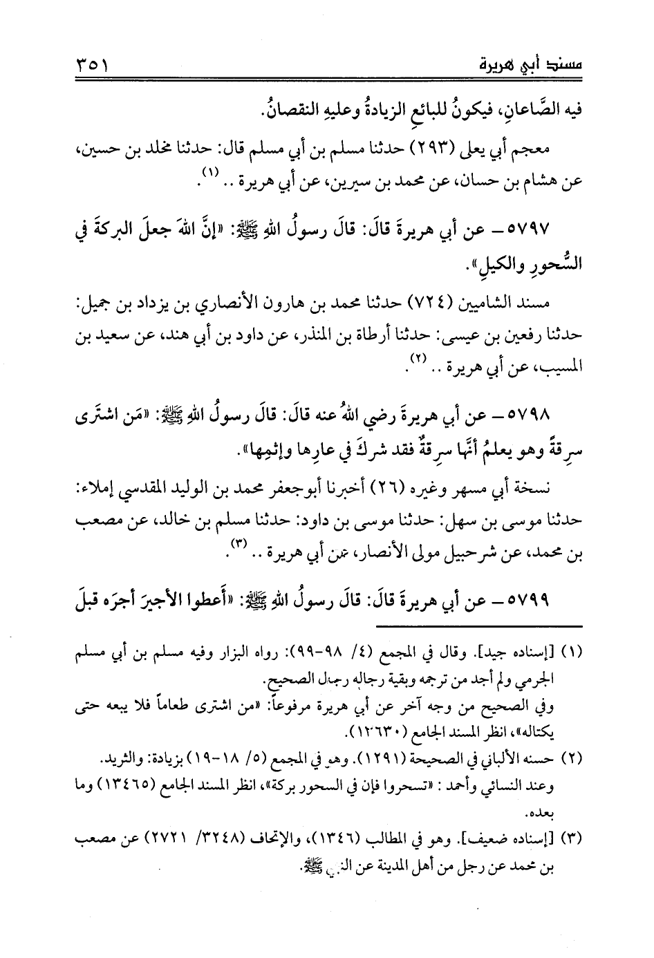 5797 - عن أبي هريرةَ قالَ: قالَ رسولُ اللهِ صلى الله عليه وسلم: «إنَّ اللهَ جعلَ البركةَ في السُّحورِ والكيلِ».