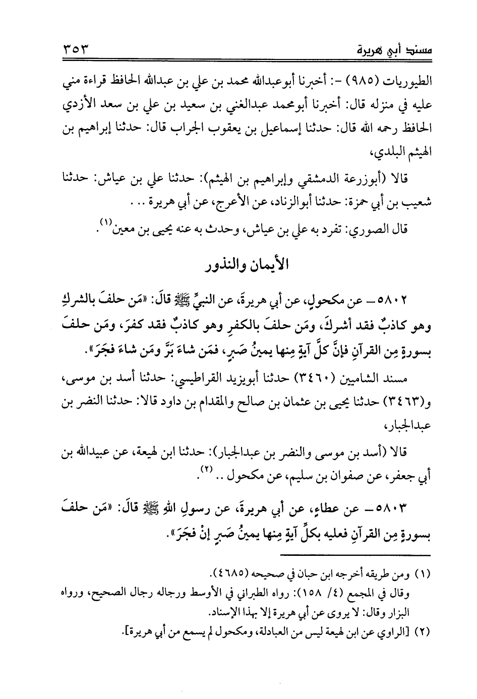 5802 - عن مكحولٍ، عن أبي هريرةَ، عن النبيِّ صلى الله عليه وسلم قالَ: «مَن حلفَ بالشركِ وهو كاذبٌ فقد أشركَ، ومَن حلفَ بالكفرِ وهو كاذبٌ فقد كفرَ، ومَن حلفَ بسورةٍ مِن القرآنِ فإنَّ كلَّ آيةٍ مِنها يمينُ صَبرٍ، فمَن شاءَ بَرَّ ومَن شاءَ فجَرَ».
