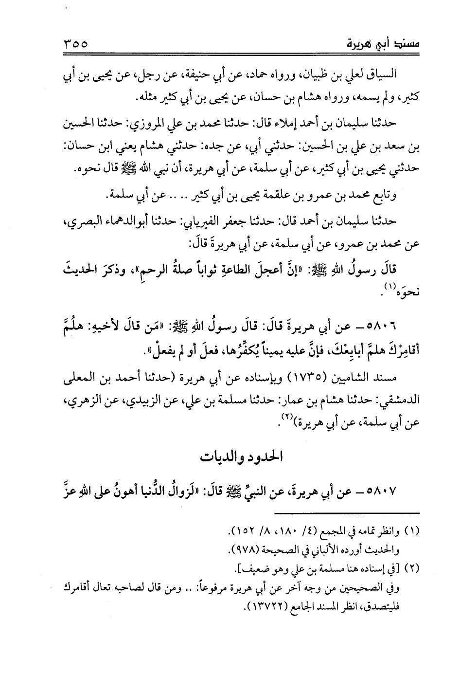 مسند الشاميين (1735) وبإسناده عن أبي هريرة (حدثنا أحمد بن المعلى الدمشقي: حدثنا هشام بن عمار: حدثنا مسلمة بن علي، عن الزبيدي، عن الزهري، عن أبي سلمة، عن أبي هريرة) (¬2).