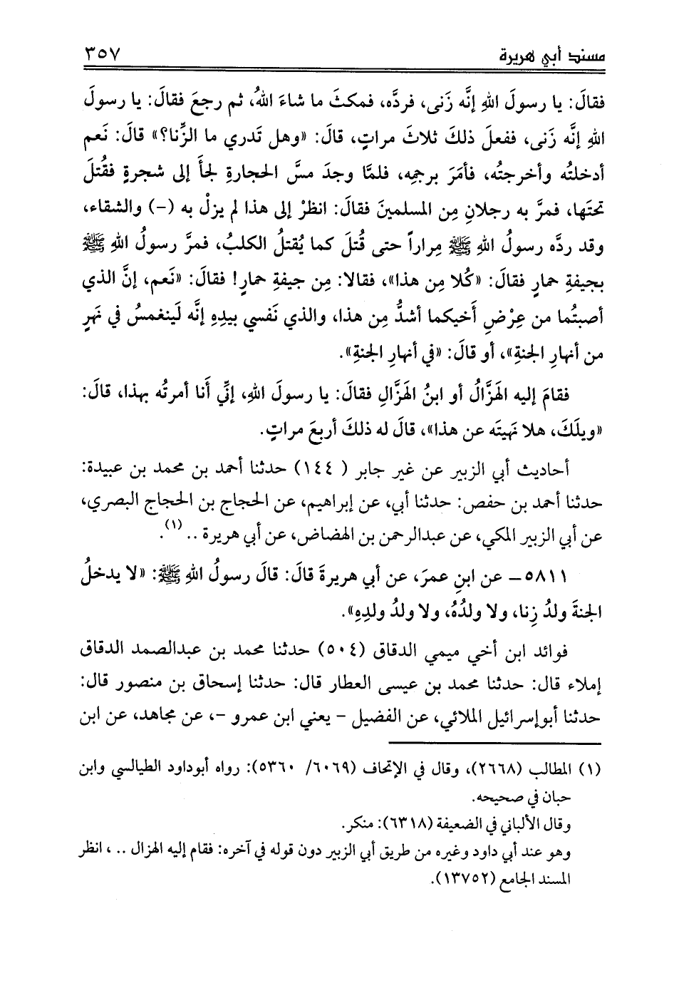 5811 - عن ابنِ عمرَ، عن أبي هريرةَ قالَ: قالَ رسولُ اللهِ صلى الله عليه وسلم: «لا يدخلُ الجنةَ ولدُ زِنا، ولا ولدُهُ، ولا ولدُ ولدِهِ».