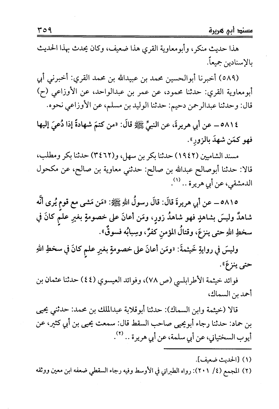 5815 - عن أبي هريرةَ قالَ: قالَ رسولُ اللهِ صلى الله عليه وسلم: «مَن مَشى مع قومٍ يُرى أنَّه شاهدٌ وليسَ بشاهدٍ فهو شاهدُ زورٍ، ومَن أعانَ على خصومةٍ بغيرِ علمٍ كانَ في سخطِ اللهِ حتى ينزعَ، وقتالُ المؤمنِ كفرٌ، وسِبابُه فسوقٌ».