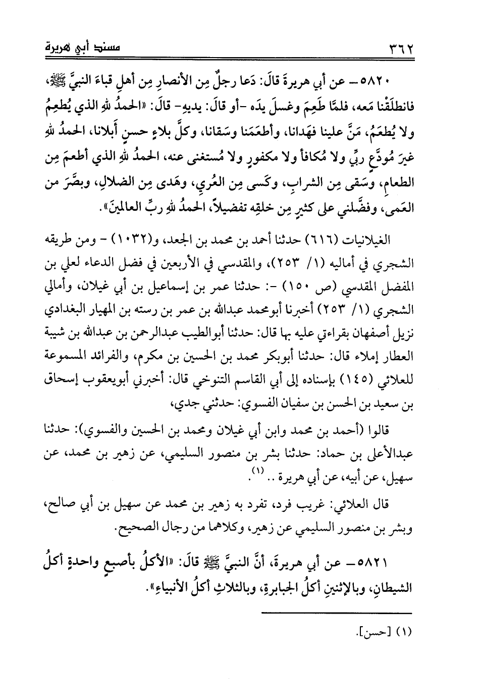 5820 - عن أبي هريرةَ قالَ: دَعا رجلٌ مِن الأنصارِ مِن أهلِ قباءَ النبيَّ صلى الله عليه وسلم، فانطلَقْنا مَعه، فلمَّا طَعِمَ وغسلَ يدَه -أو قالَ: يديهِ- قالَ: «الحمدُ للهِ الذي يُطعِمُ ولا يُطعَمُ، مَنَّ علينا فهَدانا، وأطعَمَنا وسَقانا، وكلَّ بلاءٍ حسنٍ أَبلانا، الحمدُ للهِ غيرَ مُودَّعٍ ربِّي ولا مُكافأ ولا مكفورٍ ولا مُستغنى عنه، الحمدُ للهِ الذي أطعمَ مِن الطعامِ، وسَقى مِن الشرابِ، وكَسى مِن العُريِ، وهَدى مِن الضلالِ، وبصَّرَ من العَمى، وفضَّلني على كثيرٍ مِن خلقِه تفضيلاً، الحمدُ للهِ ربِّ العالمينَ».