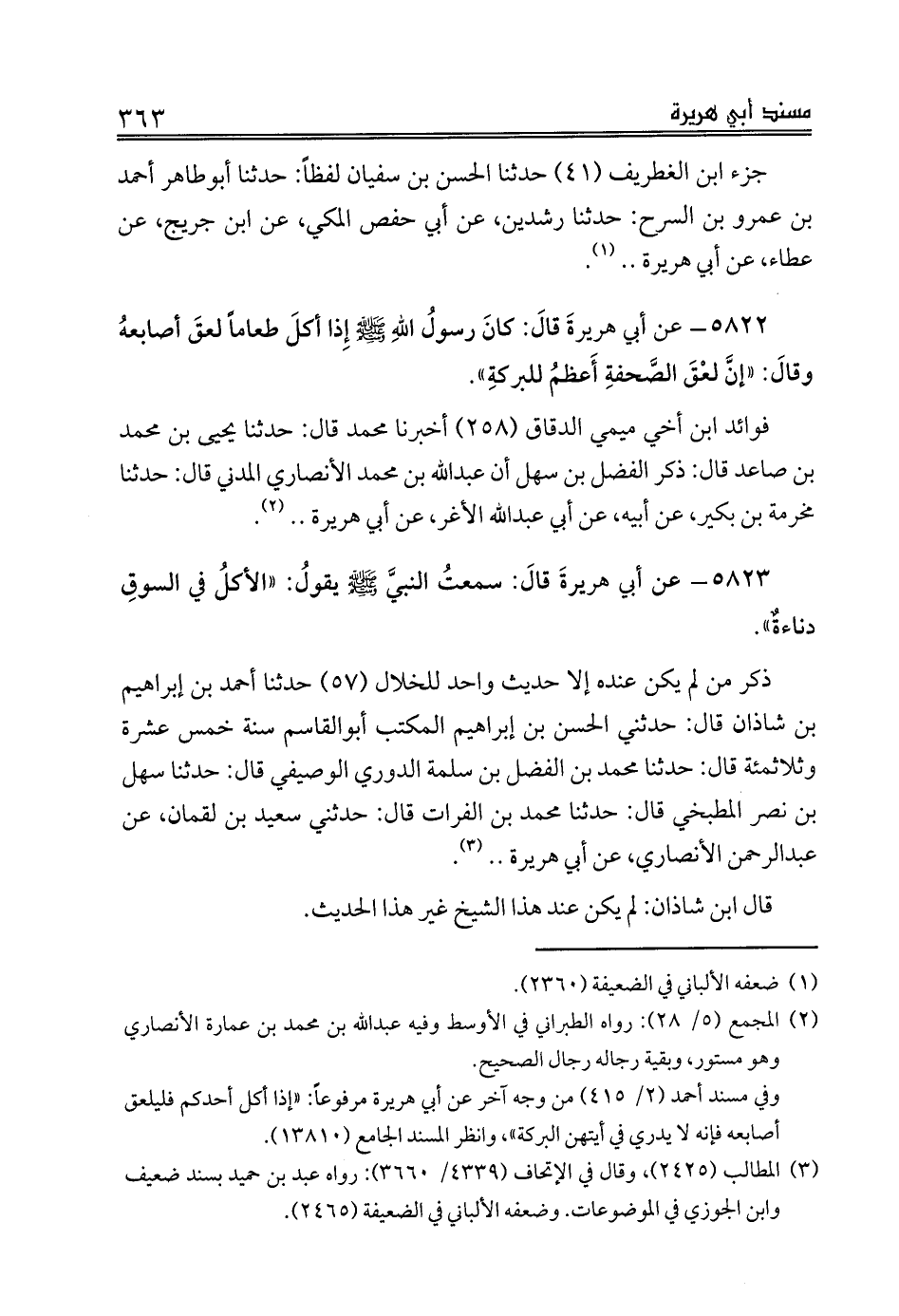 5822 - عن أبي هريرةَ قالَ: كانَ رسولُ اللهِ صلى الله عليه وسلم إِذا أكلَ طعاماً لعقَ أصابعهُ وقالَ: «إنَّ لعْقَ الصَّحفةِ أَعظمُ للبركةِ».