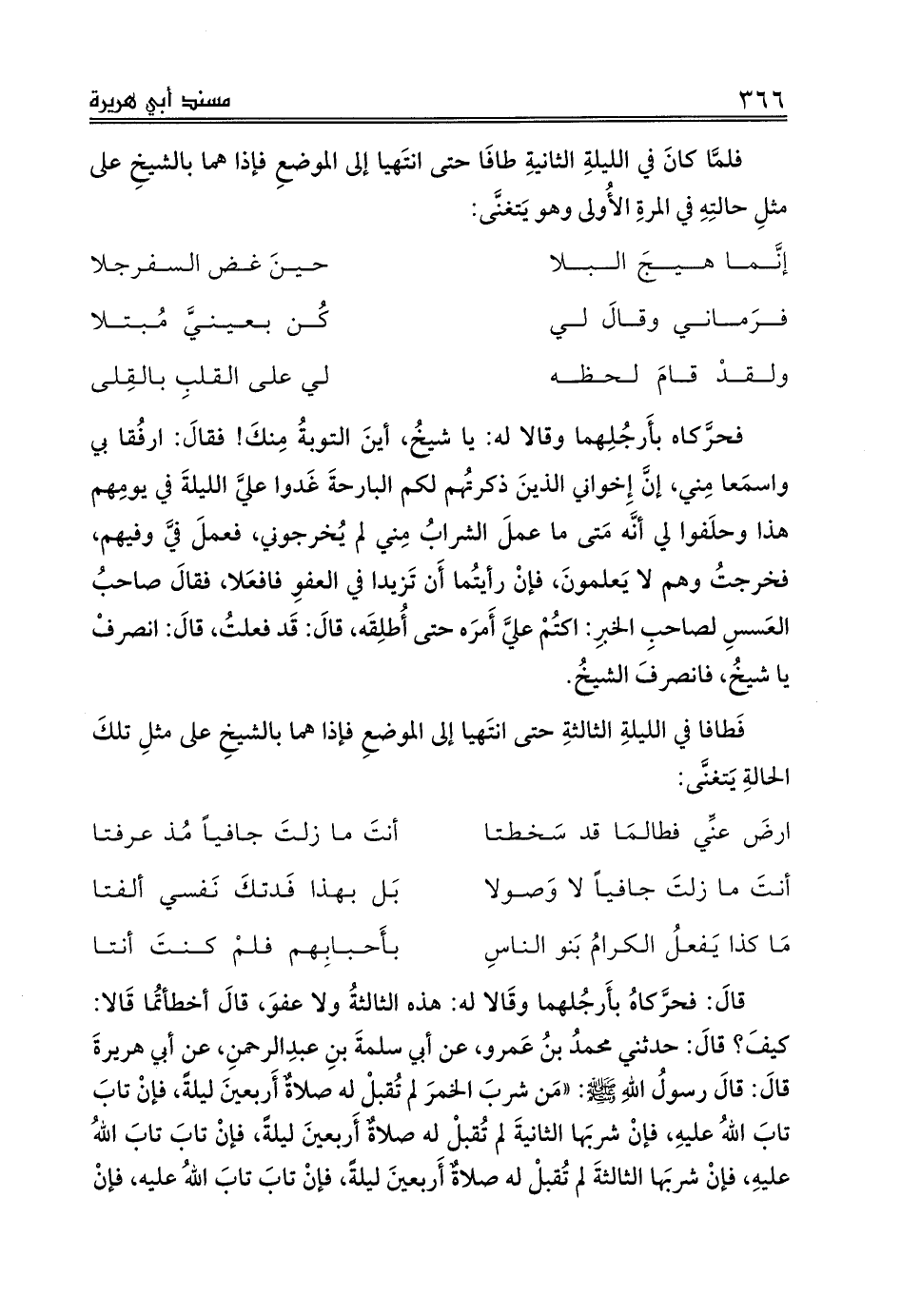 قالَ: فحرَّكاهُ بأَرجُلهما وقَالا له: هذه الثالثةُ ولا عفوَ، قالَ أخطأتُما قَالا: كيفَ؟ قالَ: حدثني محمدُ بنُ عَمرو، عن أبي سلمةَ بنِ عبدِالرحمنِ، عن أبي هريرةَ قالَ: قالَ رسولُ اللهِ صلى الله عليه وسلم: «مَن شربَ الخمرَ لم تُقبلْ له صلاةٌ أَربعينَ ليلةً، فإنْ تابَ تابَ اللهُ عليهِ، فإنْ شربَها الثانيةَ لم تُقبلْ له صلاةٌ أَربعينَ ليلةً، فإنْ تابَ تابَ اللهُ عليهِ، فإنْ شربَها الثالثةَ لم تُقبلْ له صلاةٌ أَربعينَ ليلةً، فإنْ تابَ تابَ اللهُ عليه،