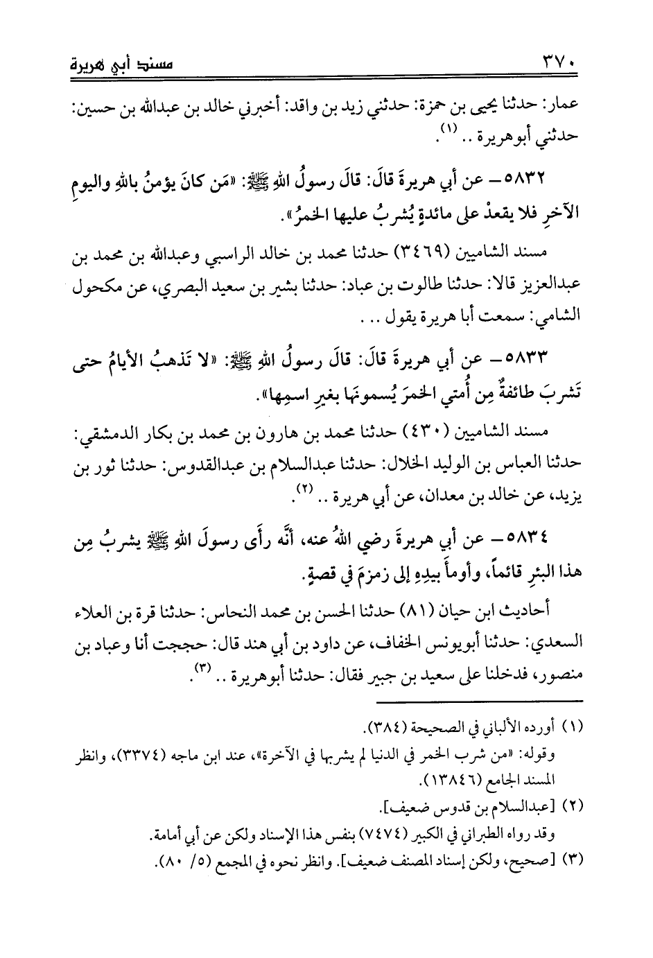 5833 - عن أبي هريرةَ قالَ: قالَ رسولُ اللهِ صلى الله عليه وسلم: «لا تَذهبُ الأيامُ حتى تَشربَ طائفةٌ مِن أُمتي الخمرَ يُسمونَها بغيرِ اسمِها».