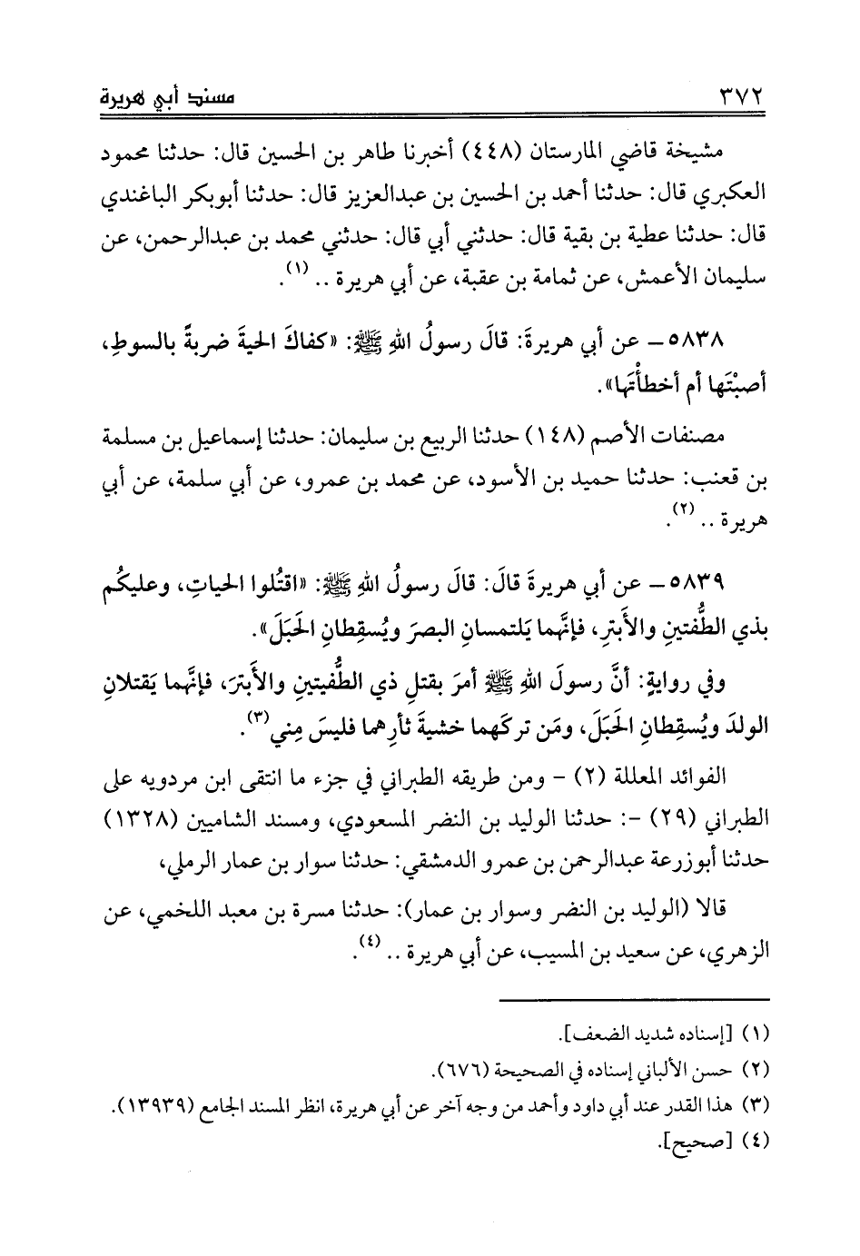 5838 - عن أبي هريرةَ قالَ رسولُ اللهِ صلى الله عليه وسلم: «كفاكَ الحيةَ ضربةً بالسوطِ، أصبْتَها أم أخطأْتَها».