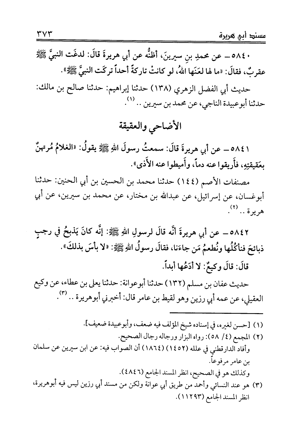 5841 - عن أبي هريرةَ قالَ: سمعتُ رسولَ اللهِ صلى الله عليه وسلم يقولُ: «الغلامُ مُرتهنٌ بعَقيقتِهِ، فأَريقوا عنه دماً، وأَميطوا عنه الأَذى».