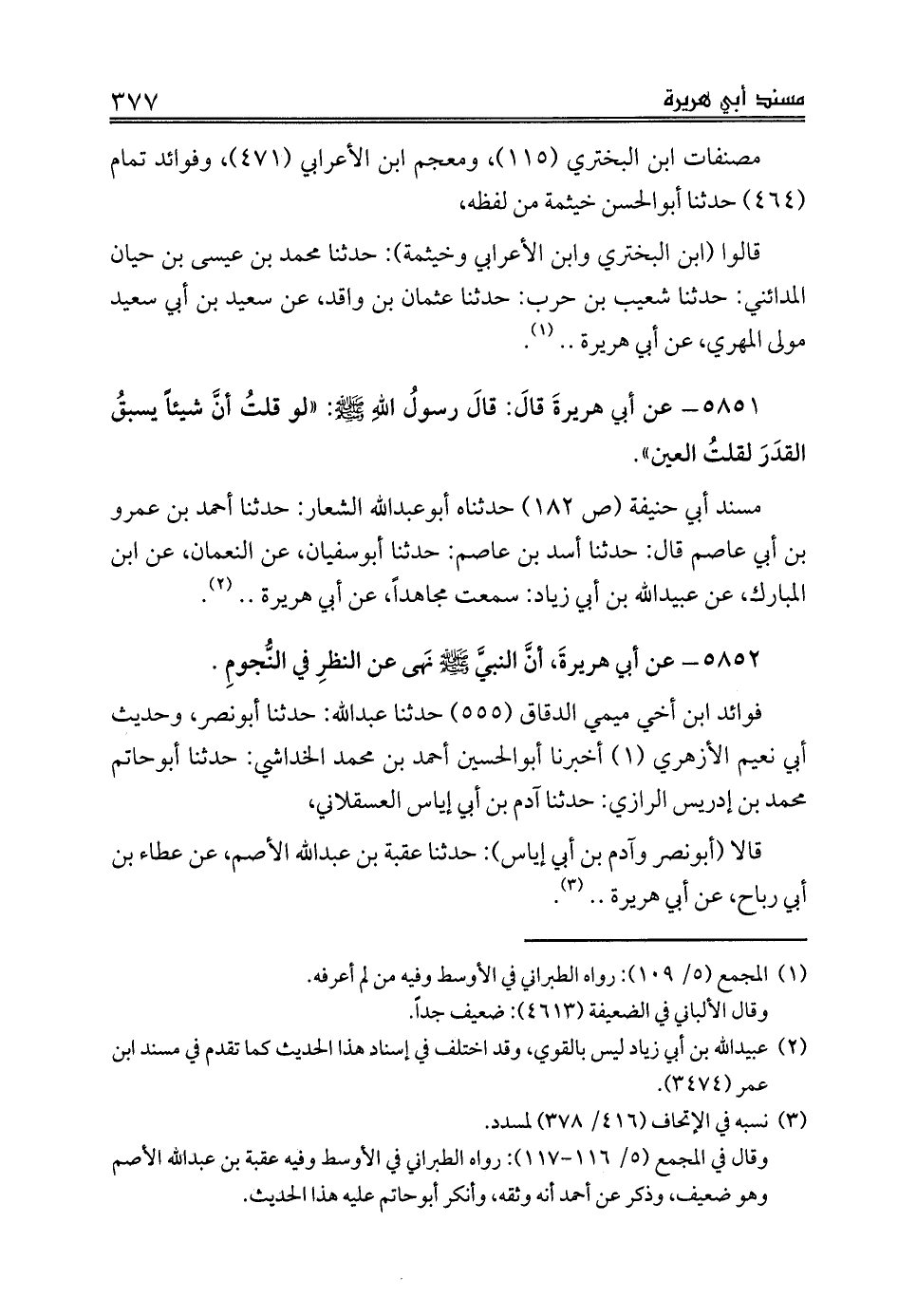 مسند أبي حنيفة (ص 182) حدثناه أبوعبدالله الشعار: حدثنا أحمد بن عمرو بن أبي عاصم قال: حدثنا أسد بن عاصم: حدثنا أبوسفيان، عن النعمان، عن ابن المبارك، عن عبيدالله بن أبي زياد: سمعت مجاهداً، عن أبي هريرة .. (¬2).