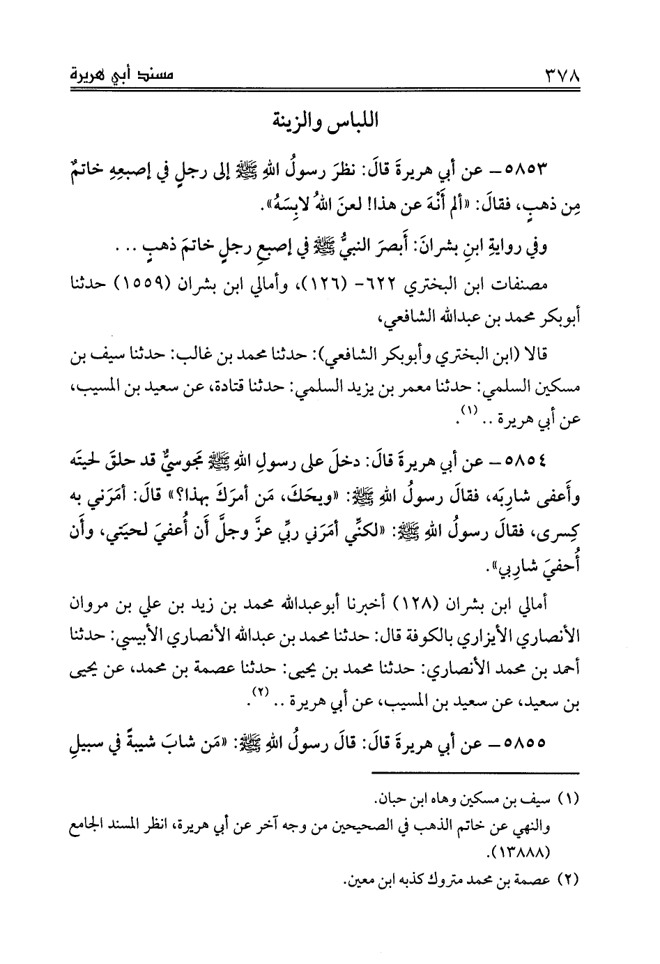 5853 - عن أبي هريرةَ قالَ: نظرَ رسولُ اللهِ صلى الله عليه وسلم إلى رجلٍ في إصبعِهِ خاتمٌ مِن ذهبٍ، فقالَ: «ألم أَنْهَ عن هذا! لعنَ اللهُ لابِسَهُ».