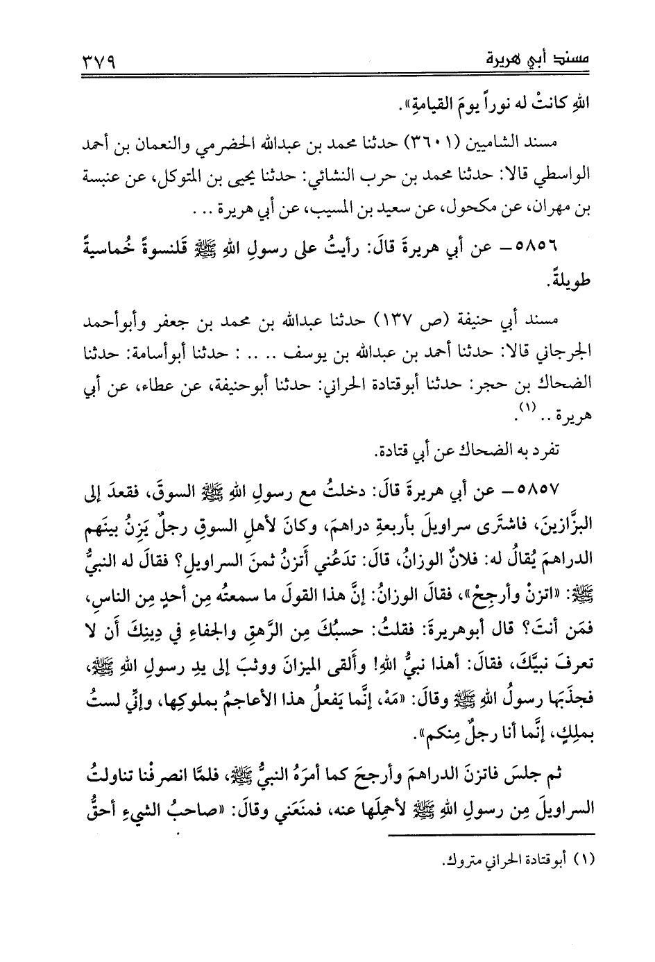 5857 - عن أبي هريرةَ قالَ: دخلتُ مع رسولِ اللهِ صلى الله عليه وسلم السوقَ، فقعدَ إلى البزَّازينَ، فاشتَرى سراويلَ بأربعةِ دراهمَ، وكانَ لأهلِ السوقِ رجلٌ يَزِنُ بينَهم الدراهمَ يُقالُ له: فلانٌ الوزانُ، قالَ: تدَعُني أَتزنُ ثمنَ السراويلَ؟ فقالَ له النبيُّ صلى الله عليه وسلم: «اتزنْ وأرجِحْ»، فقالَ الوزانُ: إنَّ هذا القولَ ما سمعتُه مِن أحدٍ مِن الناسِ، فمَن أنتَ؟ قال أبوهريرةَ: فقلتُ: حسبُكَ مِن الرَّهقِ والجفاءِ في دِينِكَ أَن لا تعرفَ نبيَّكَ، فقالَ: أهذا نبيُّ اللهِ! وأَلقى الميزانَ ووثبَ إلى يدِ رسولِ اللهِ صلى الله عليه وسلم، فجذَبَها رسولُ اللهِ صلى الله عليه وسلم وقالَ: «مَهْ، إنَّما يَفعلُ هذا الأعاجمُ بملوكِها، وإنِّي لستُ بملِكٍ، إنَّما أنا رجلٌ مِنكم».