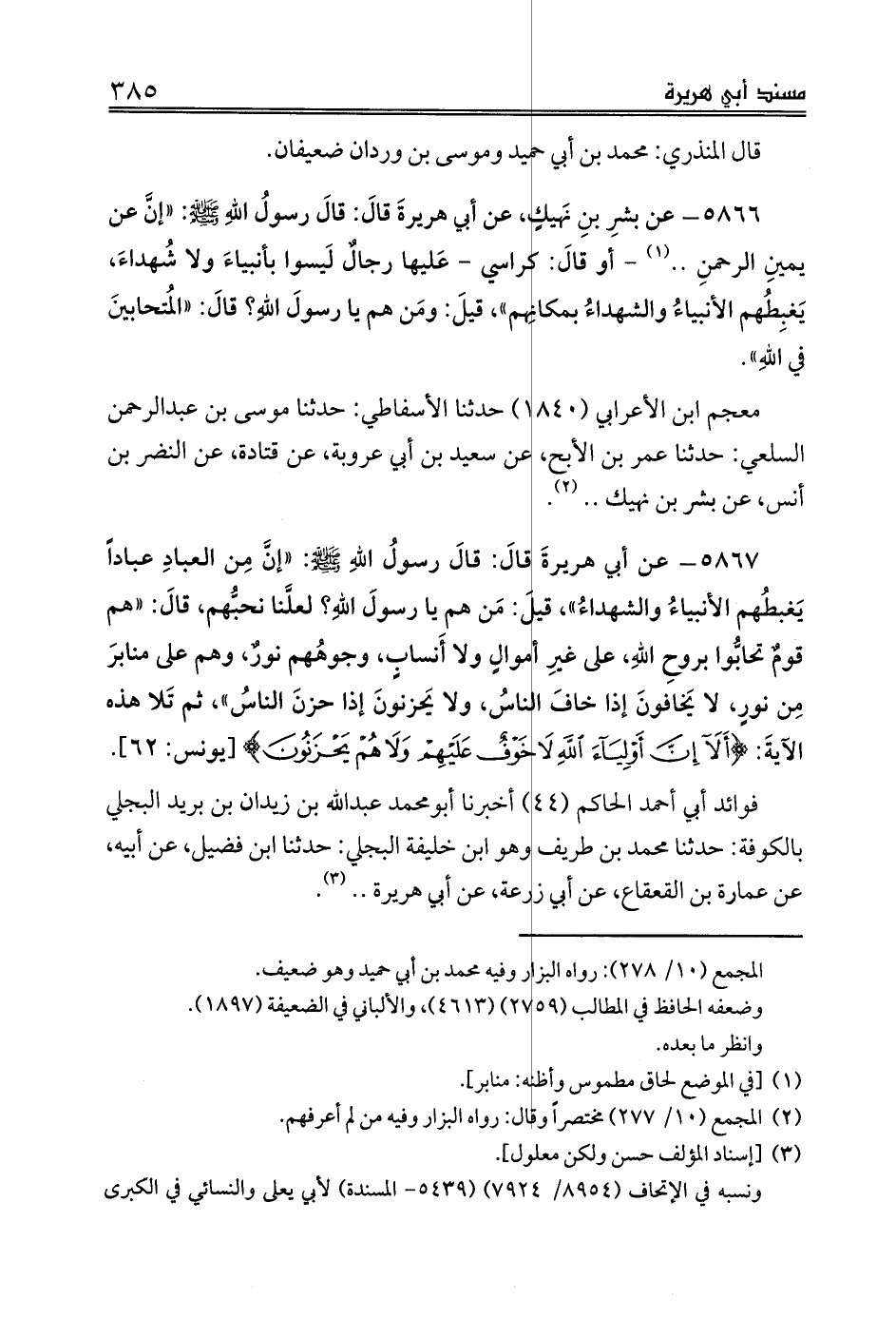 5866 - عن بشرِ بنِ نَهيكٍ، عن أبي هريرةَ قالَ: قالَ رسولُ اللهِ صلى الله عليه وسلم: «إنَّ عن يمينِ الرحمنِ .. (¬1) - أو قالَ: كراسي - عَليها رجالٌ لَيسوا بأنبياءَ ولا شُهداءَ، يَغبِطُهم الأنبياءُ والشهداءُ بمكانِهم»، قيلَ: ومَن هم يا رسولَ اللهِ؟ قالَ: «المُتحابينَ في اللهِ».