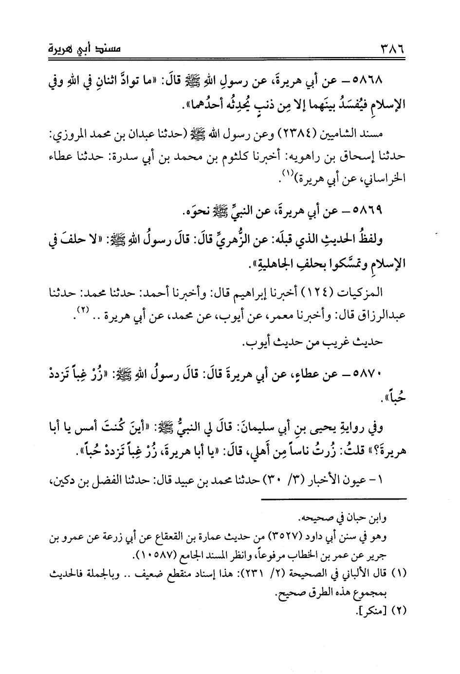 5868 - عن أبي هريرةَ، عن رسولِ اللهِ صلى الله عليه وسلم قالَ: «ما توادَّ اثنانِ في اللهِ وفي الإسلامِ فيُفسَدُ بينَهما إلا مِن ذنبٍ يُحدِثُه أحدُهما».