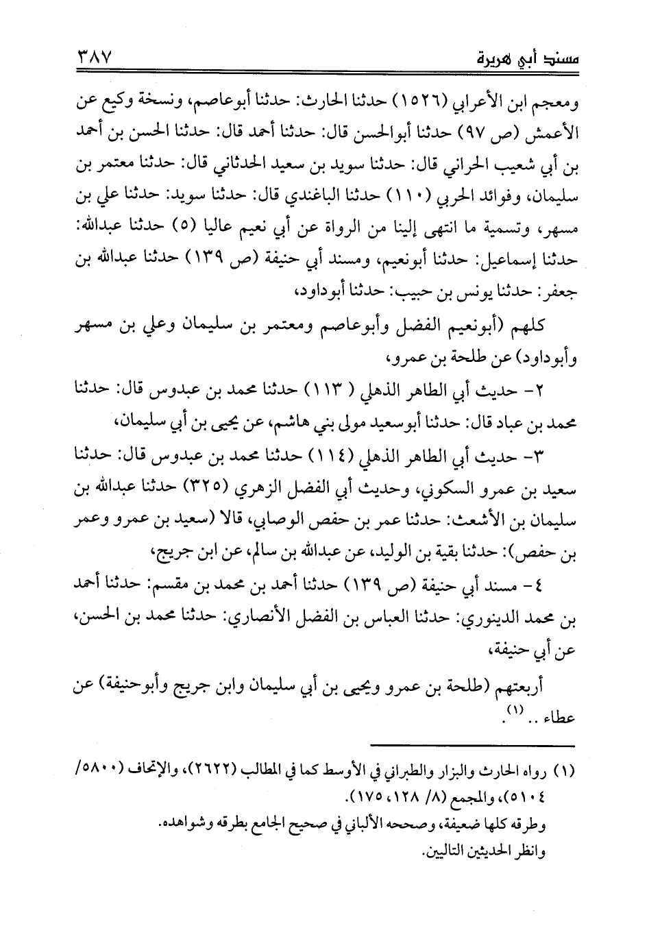 ومعجم ابن الأعرابي (1526) حدثنا الحارث: حدثنا أبوعاصم، ونسخة وكيع عن الأعمش (ص 97) حدثنا أبوالحسن قال: حدثنا أحمد قال: حدثنا الحسن بن أحمد بن أبي شعيب الحراني قال: حدثنا سويد بن سعيد الحدثاني قال: حدثنا معتمر بن سليمان، وفوائد الحربي (110) حدثنا الباغندي قال: حدثنا سويد: حدثنا علي بن مسهر، وتسمية ما انتهى إلينا من الرواة عن أبي نعيم عاليا (5) حدثنا عبدالله: حدثنا إسماعيل: حدثنا أبونعيم، ومسند أبي حنيفة (ص 139) حدثنا عبدالله بن جعفر: حدثنا يونس بن حبيب: حدثنا أبوداود،