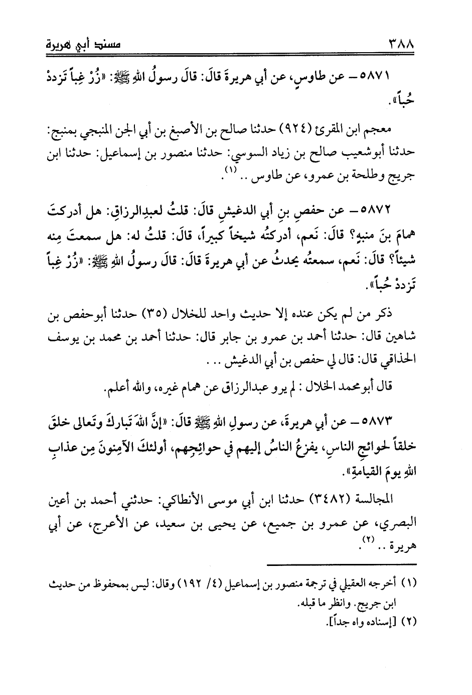 5872 - عن حفصِ بنِ أبي الدغيشِ قالَ: قلتُ لعبدِالرزاقِ: هل أدركتَ همامَ بنَ منبهٍ؟ قالَ: نَعم، أدركتُه شيخاً كبيراً، قالَ: قلتُ له: هل سمعتَ مِنه شيئاً؟ قالَ: نَعم، سمعتُه يحدثُ عن أبي هريرةَ قالَ: قالَ رسولُ اللهِ صلى الله عليه وسلم: «زُرْ غِباً تَزددْ حُباً».