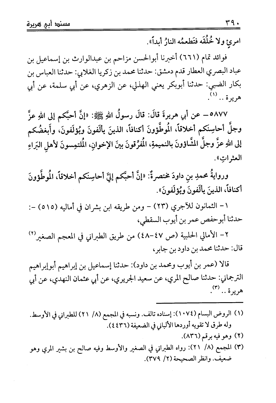 5877 - عن أبي هريرةَ قالَ: قالَ رسولُ اللهِ صلى الله عليه وسلم: «إنَّ أحبَّكم إلى اللهِ عزَّ وجلَّ أحاسِنَكم أخلاقاً، المُوطَّؤونَ أكنافاً، الذينَ يألَفونَ ويُؤلَفونَ، وأَبغضُكم إلى اللهِ عزَّ وجلَّ المشَّاؤونَ بالنميمةِ، المُفرِّقونَ بينَ الإخوانِ، المُلتمِسونَ لأهلِ البَراءِ العثراتِ».
