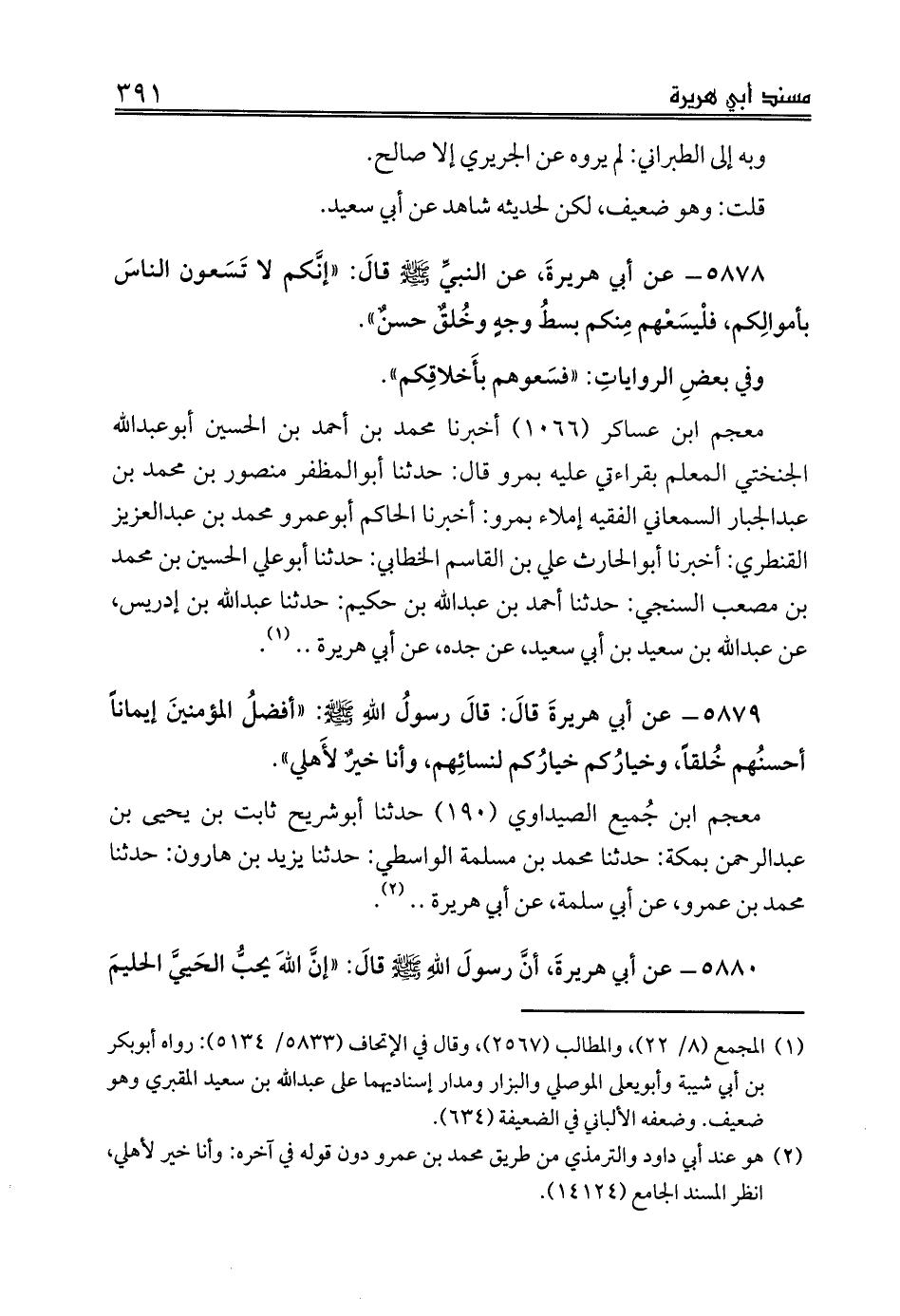5878 - عن أبي هريرةَ، عن النبيِّ صلى الله عليه وسلم قالَ: «إنَّكم لا تَسَعون الناسَ بأموالِكم، فلْيسَعْهم مِنكم بسطُ وجهٍ وخُلقٌ حسنٌ».