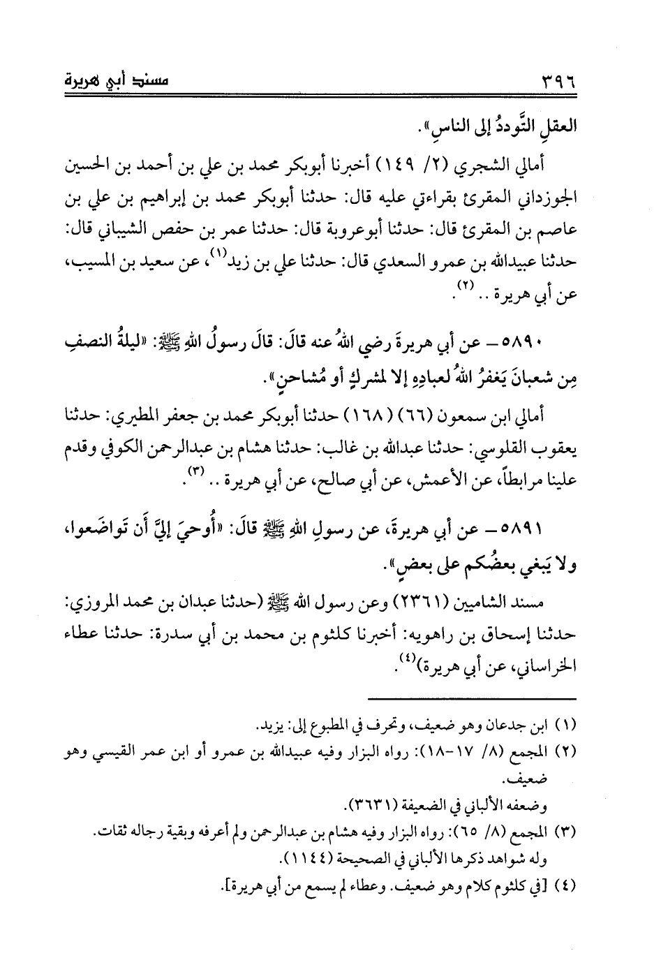 أمالي الشجري (2/ 149) أخبرنا أبوبكر محمد بن علي بن أحمد بن الحسين الجوزداني المقرئ بقراءتي عليه قال: حدثنا أبوبكر محمد بن إبراهيم بن علي بن عاصم بن المقرئ قال: حدثنا أبوعروبة قال: حدثنا عمر بن حفص الشيباني قال: حدثنا عبيدالله بن عمرو السعدي قال: حدثنا علي بن زيد (¬1)، عن سعيد بن المسيب، عن أبي هريرة .. (¬2).