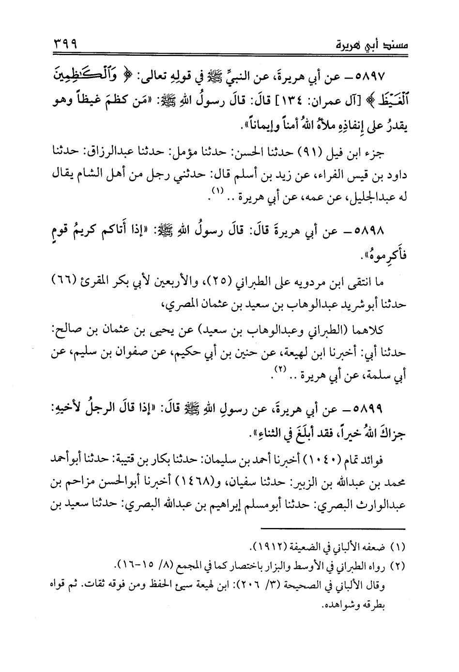 5897 - عن أبي هريرةَ، عن النبيِّ صلى الله عليه وسلم في قولِهِ تعالى: {وَالْكَاظِمِينَ الْغَيْظَ} [آل عمران: 134] قالَ: قالَ رسولُ اللهِ صلى الله عليه وسلم: «مَن كظمَ غيظاً وهو يقدرُ على إِنفاذِهِ ملأهُ اللهُ أمناً وإيماناً».